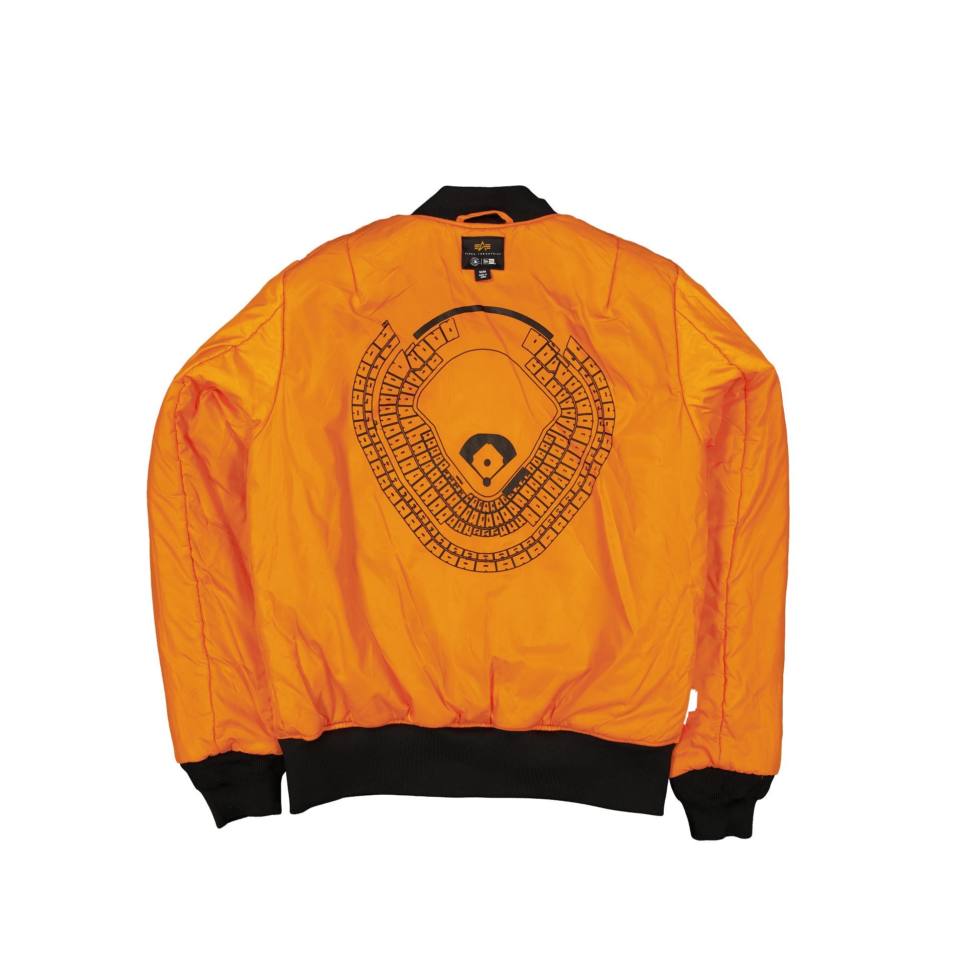 The Alpha Industries x New York Yankees Black Camo MA-1 Bomber Jacket features a screen-printed Yankees logo at the right chest with a matching team graphic at the rear. a full-zip closure at the front. and a woven New Era Cap x Alpha Industries tag at the hem. Additional details include frayed edge alternate team logos at the left chest with New York City flag. New Era Cap patch. and New York State flower patch at the right sleeve. Further details include the Yankee Stadium ballpark blueprint at the interior lining.