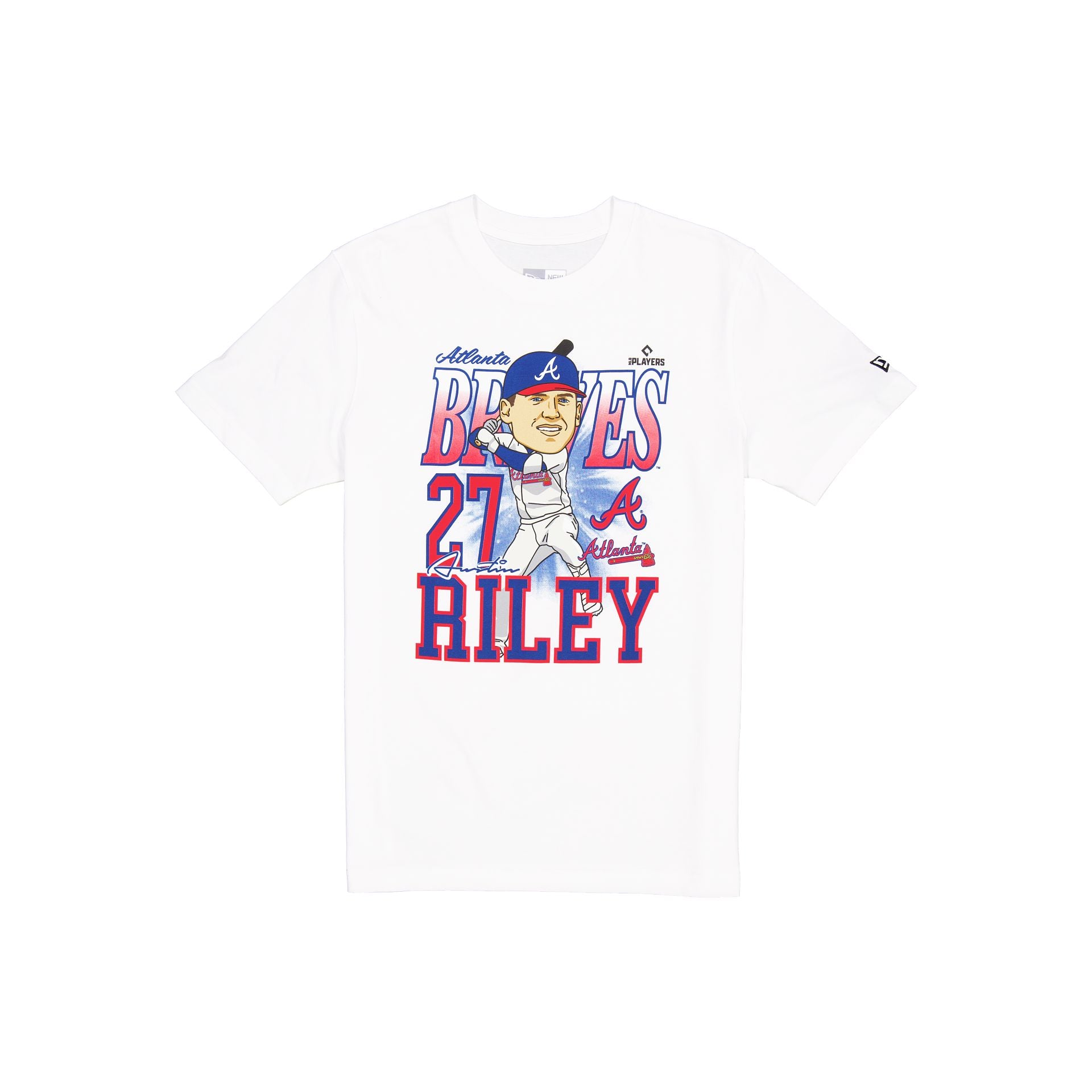 The Atlanta Braves Austin Riley Caricature T-Shirt features the player’s name and number with the Braves logo and wordmark screen-printed at the front.