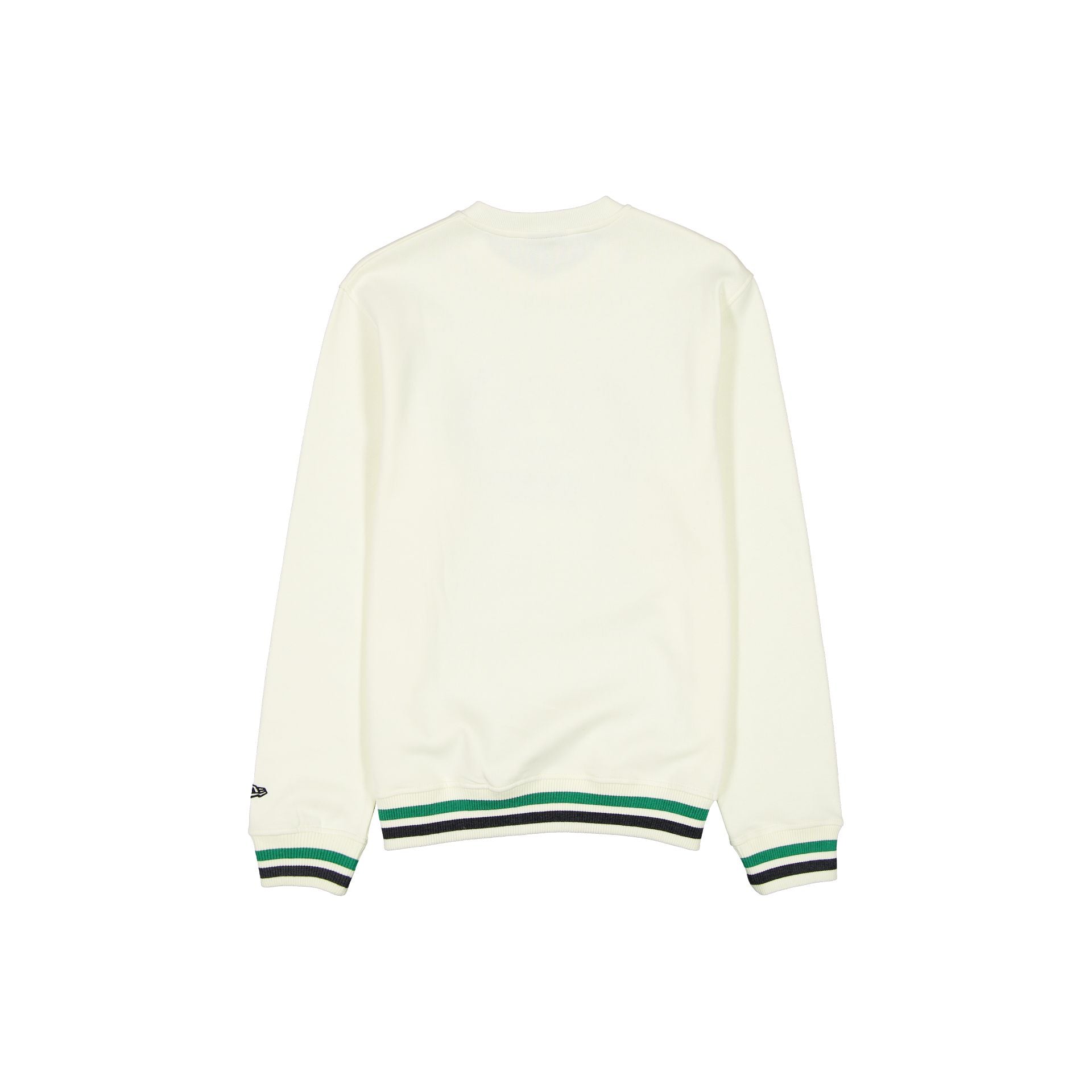 The Boston Celtics Throwback Chrome White Crewneck features a twill applique Celtics logo and an embroidered wordmark at the front with a New Era jock tag at the left hip.