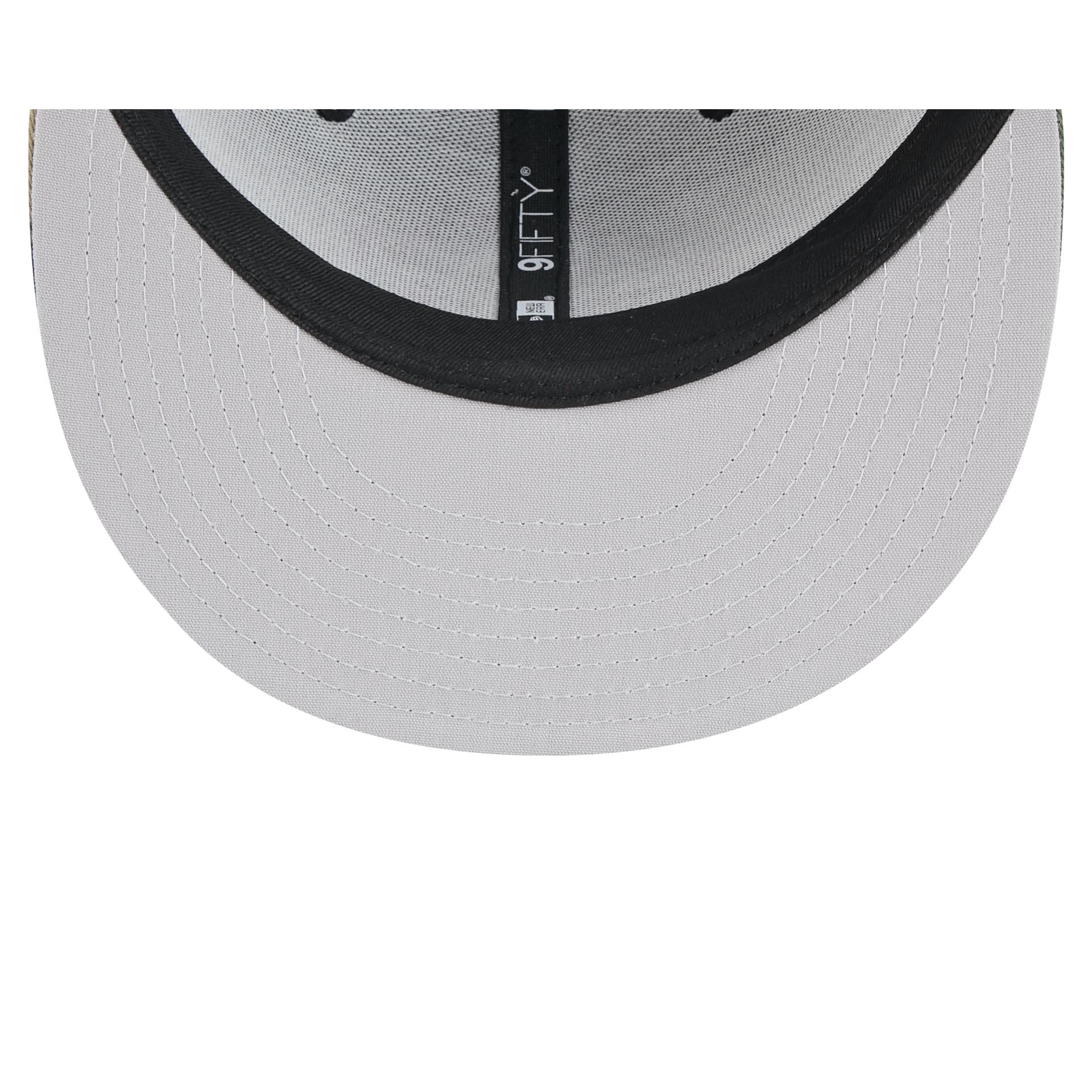 The Buffalo Sabres Alt Camo 9FIFTY Trucker features an embroidered Sabres logo at the front panels with a team tag on a snapback closure at a mesh rear and a gray undervisor.