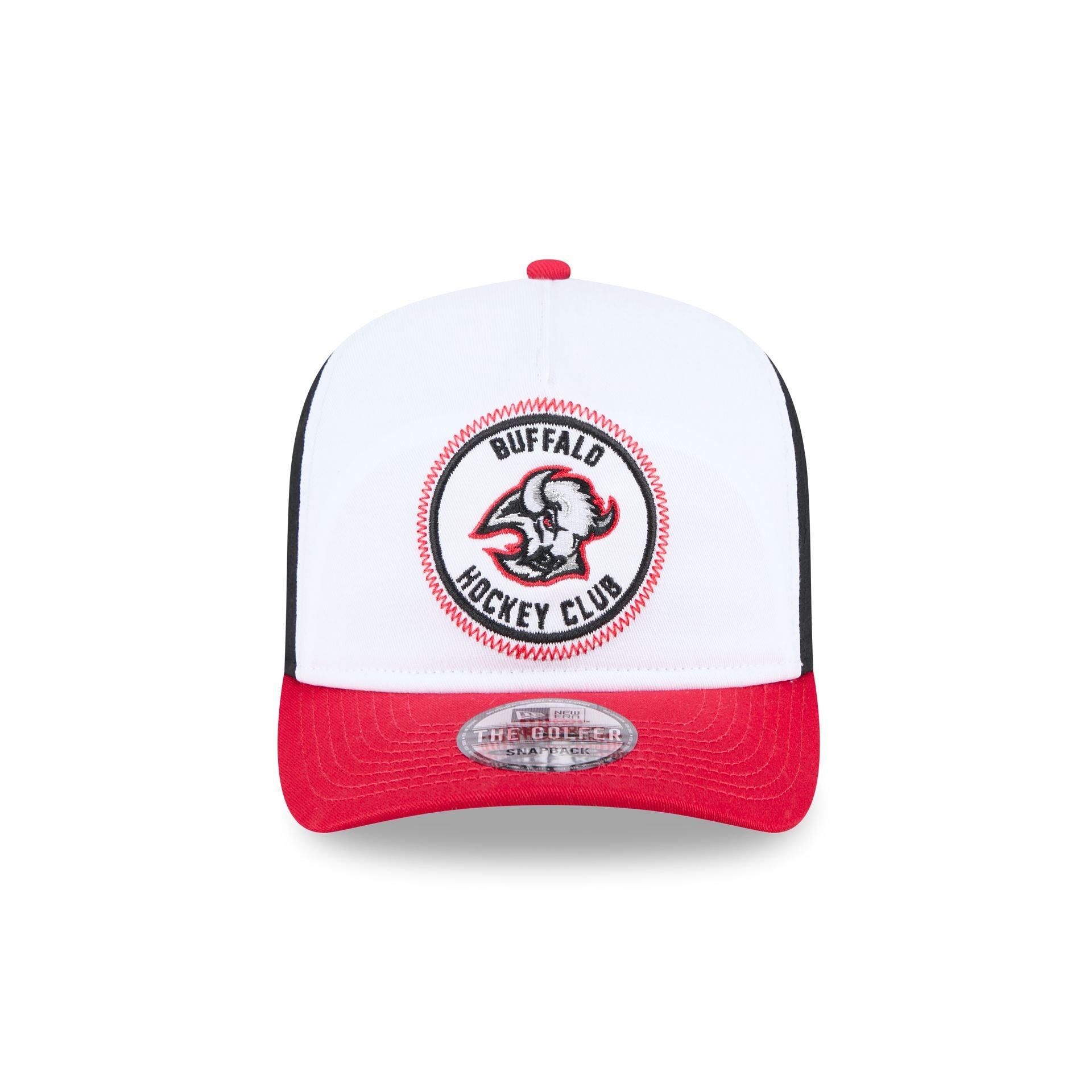 The Buffalo Sabres NHL Pack Golfer features a Sabres Hockey Club patch at the front panel with a matching NHL Shield at the right of a snapback closure at the rear and a gray undervisor.