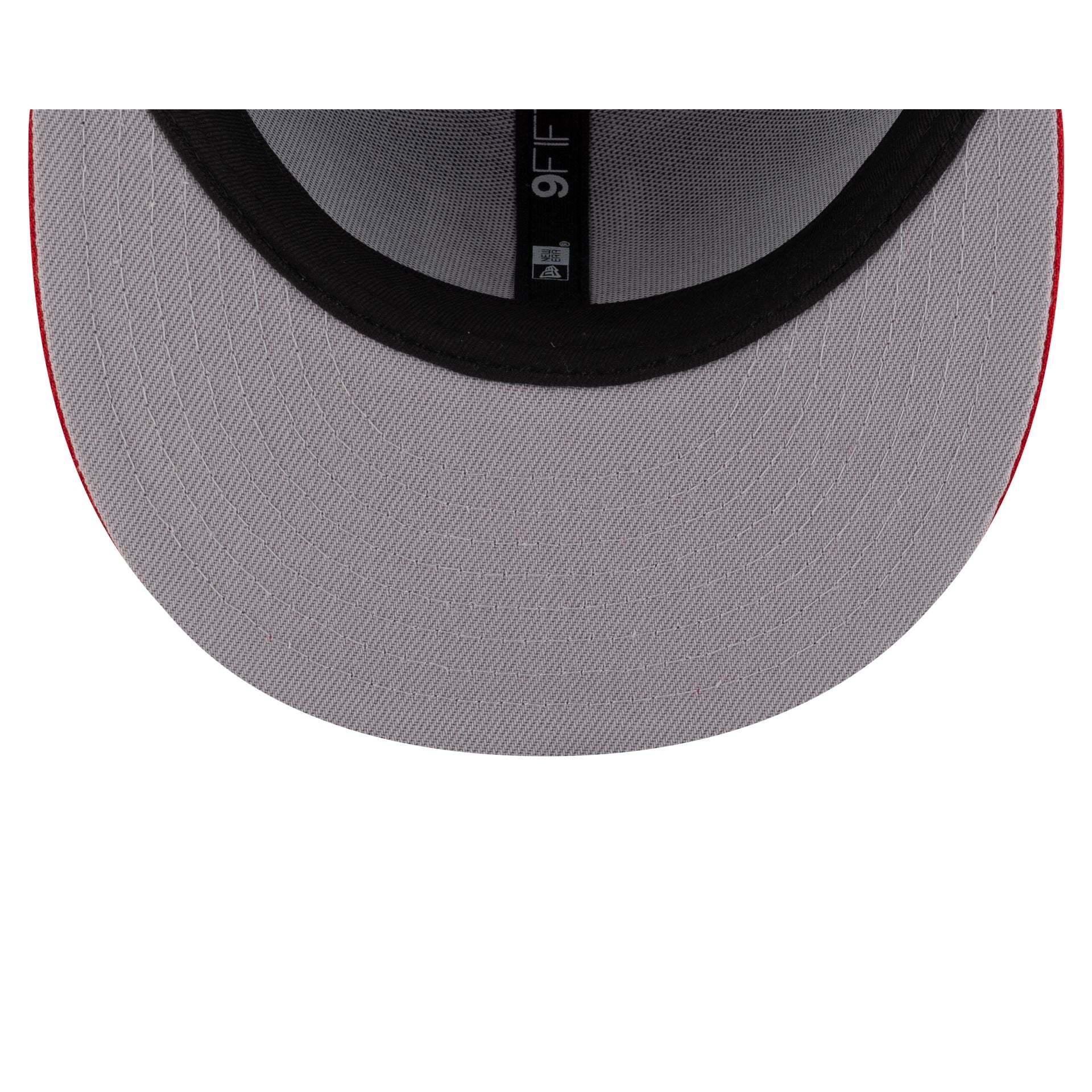 The Chicago Cubs Mascot Blue 9FIFTY Snapback features an embroidered Cubs mascot at the front panels with a Wrigley Field patch at the right-wear side. Additional details include a snapback closure at the rear and a gray undervisor.