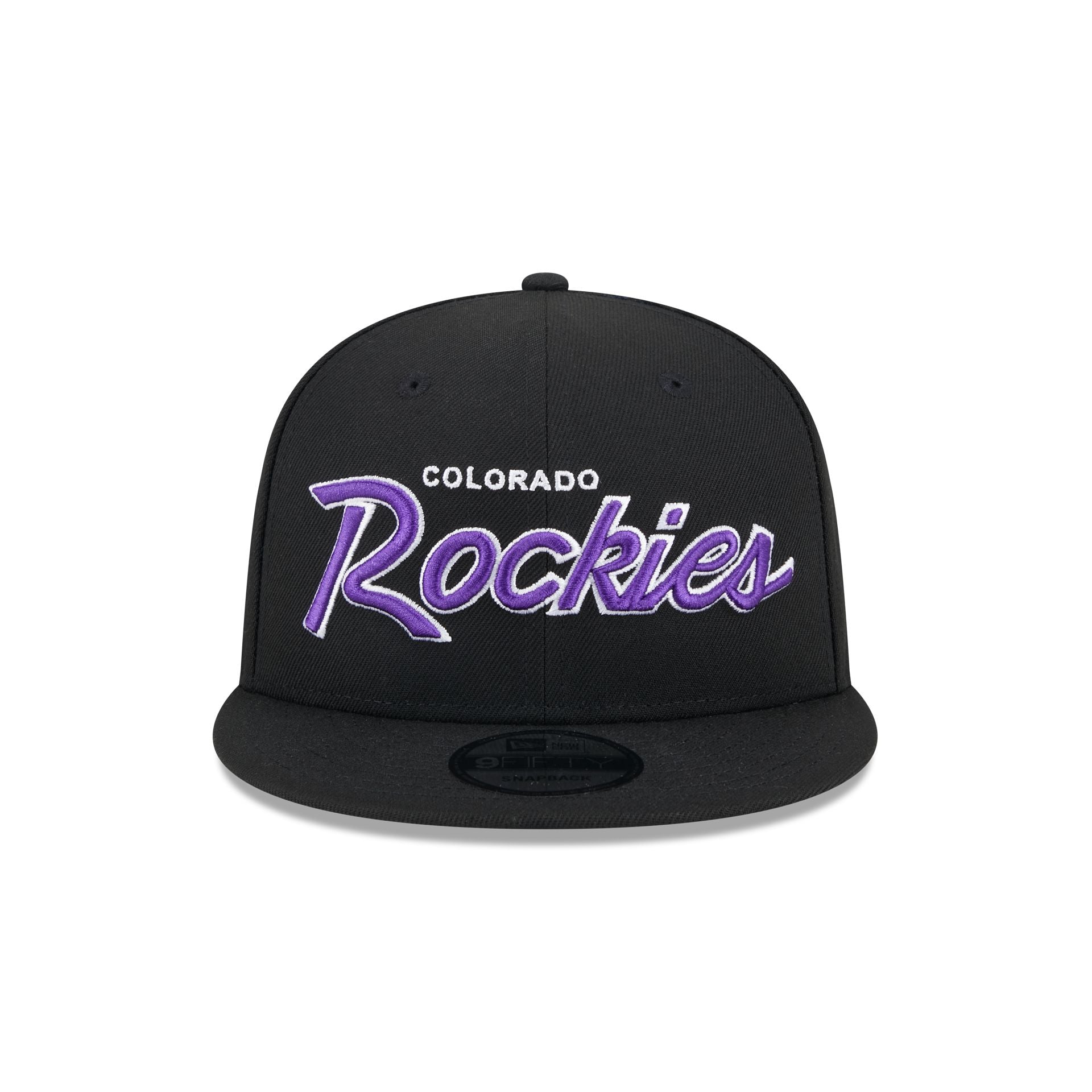 The Colorado Rockies Wordmark 9FIFTY Snapback features an embroidered Rockies wordmark at the front panels with a matching team logo at the right-wear side. a gray undervisor. and a snapback closure at the rear.