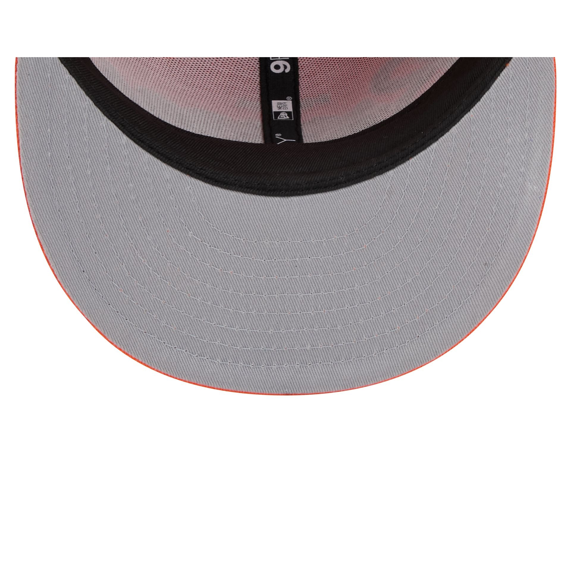 The Denver Broncos Kids 9FIFTY Snapback Hat features an embroidered Broncos wordmark at the front panels with a matching team logo at the right-wear side. Additional details include a gray undervisor and a snapback closure at the rear.