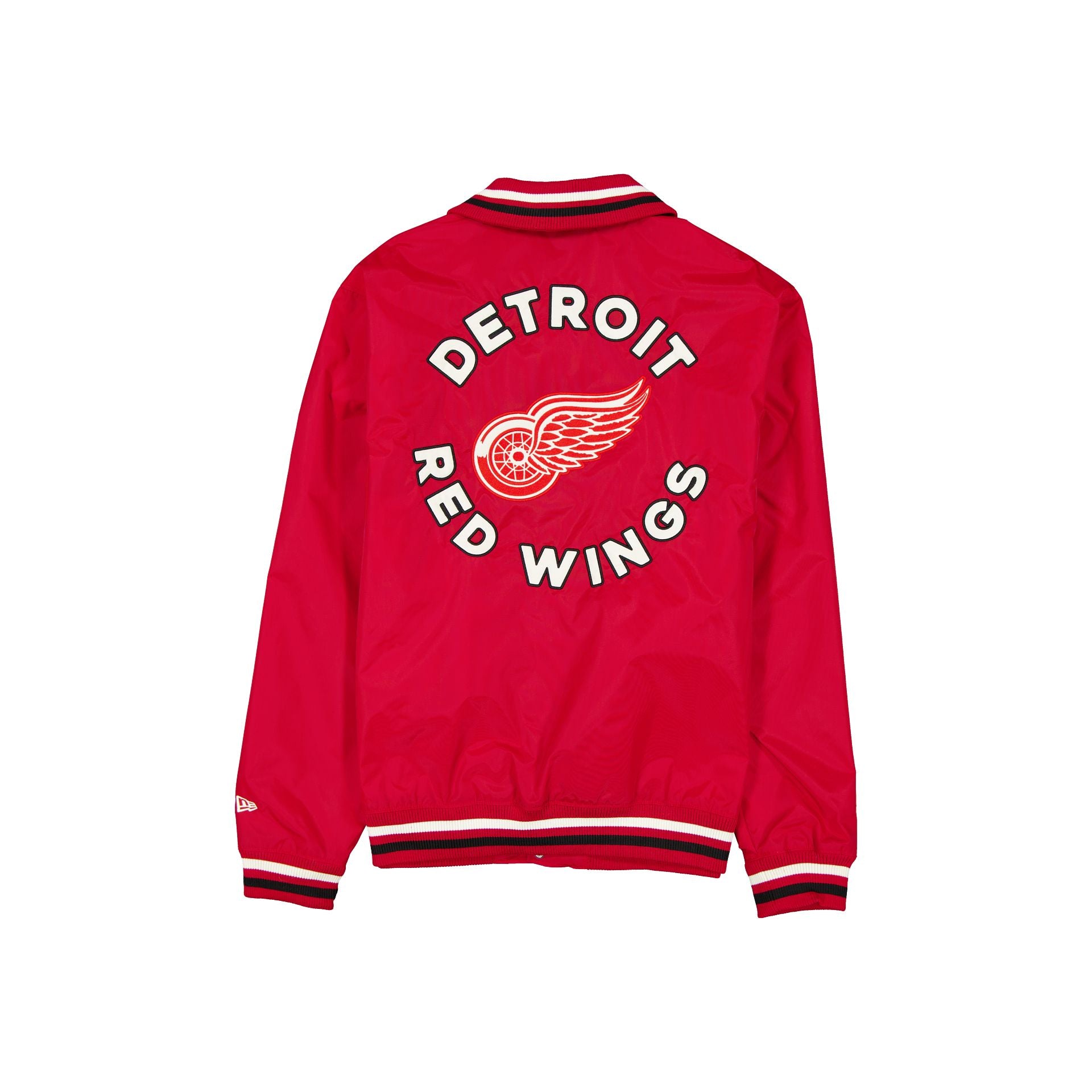 The Detroit Red Wings Throwback Jacket features an embroidered Red Wings helmet at the left chest with a logo and wordmark at the rear. Additional details include pockets. a button closure. and a New Era jock tag at the left hip.