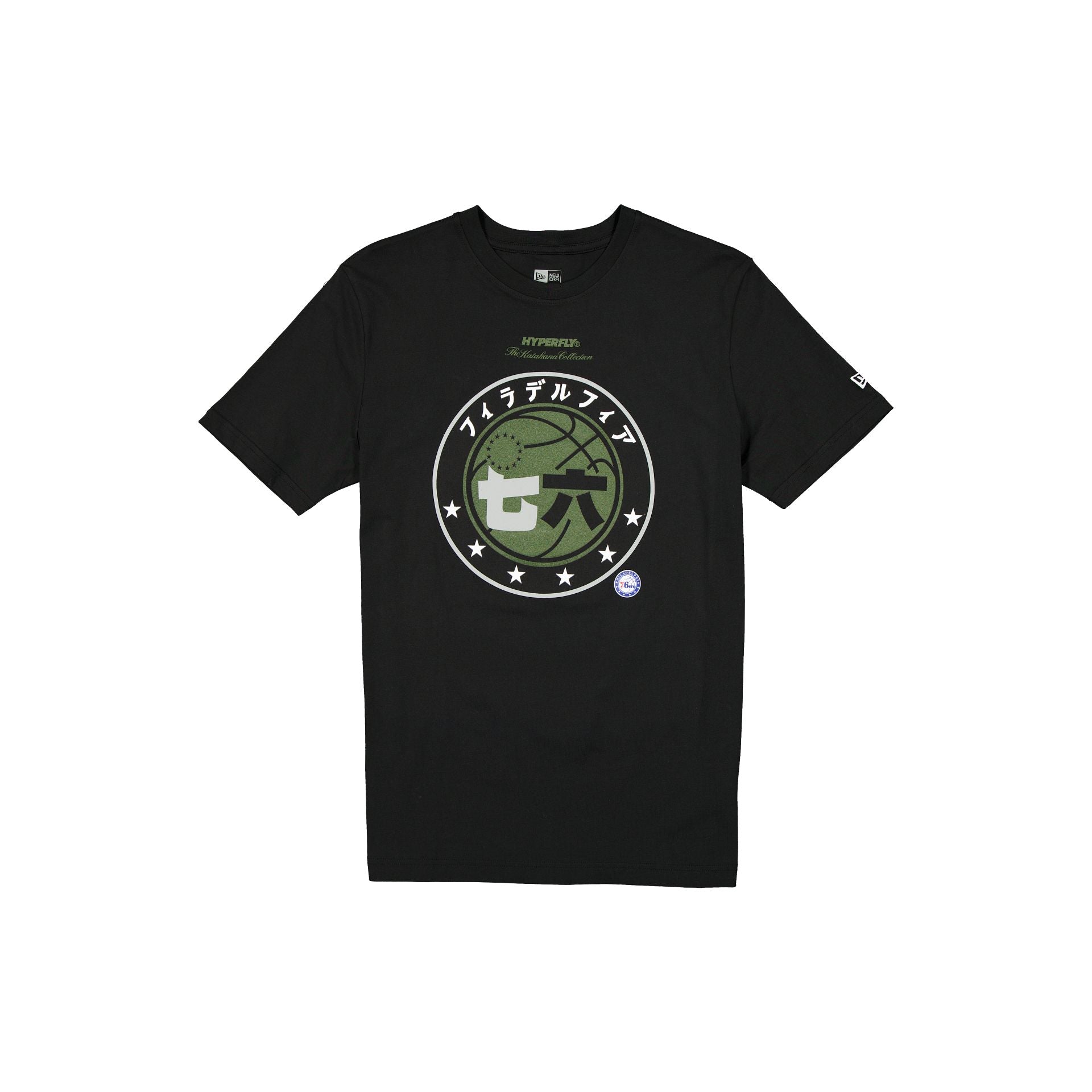 The Philadelphia 76ers 2025 All-Star Game T-Shirt features a screen-printed Katakana-themed 76ers graphic at the front.