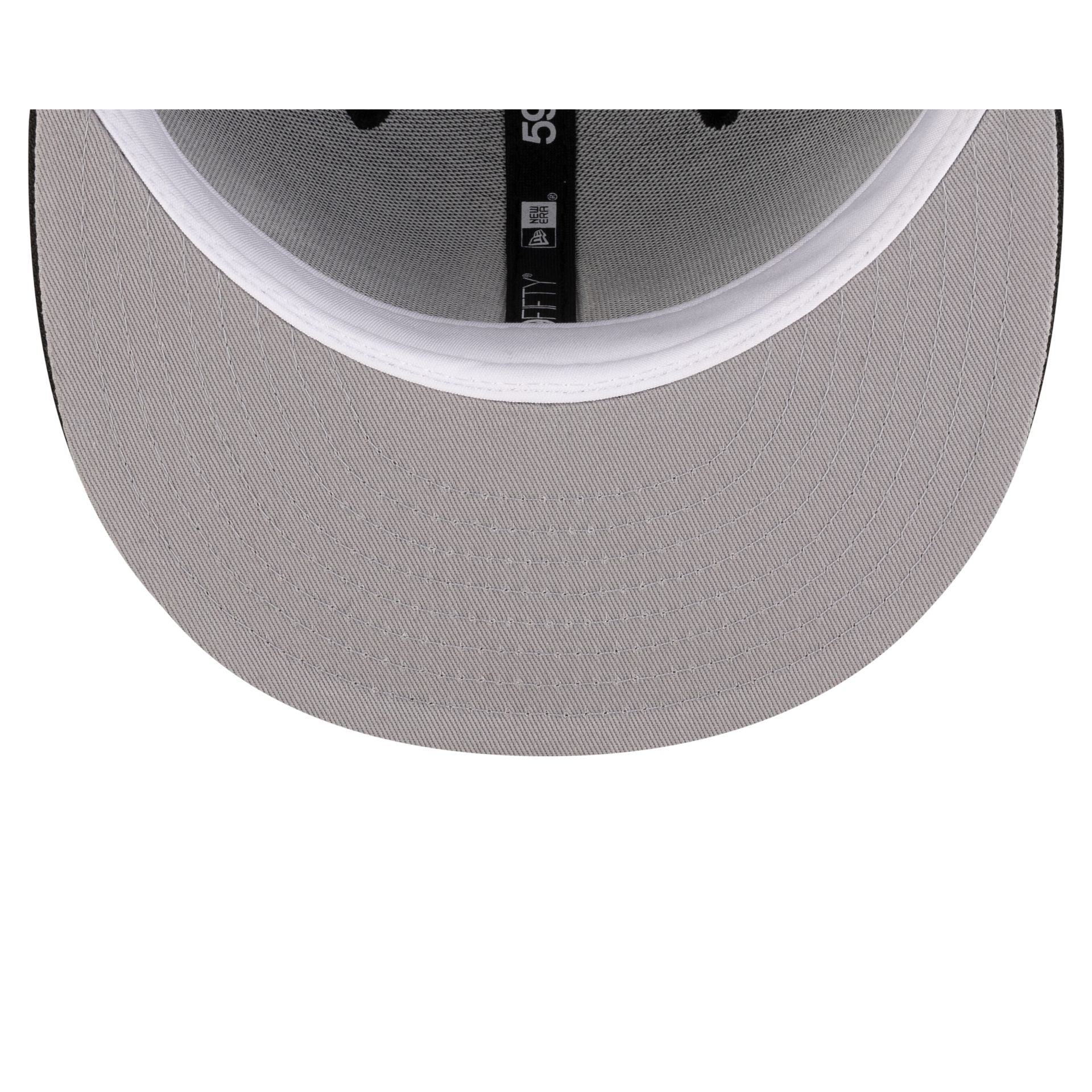 The Just Caps Gothic Script Rice University Owls 59FIFTY Fitted Cap features an embroidered Owls logo at the front panels with a team wordmark at the rear and a gray undervisor.