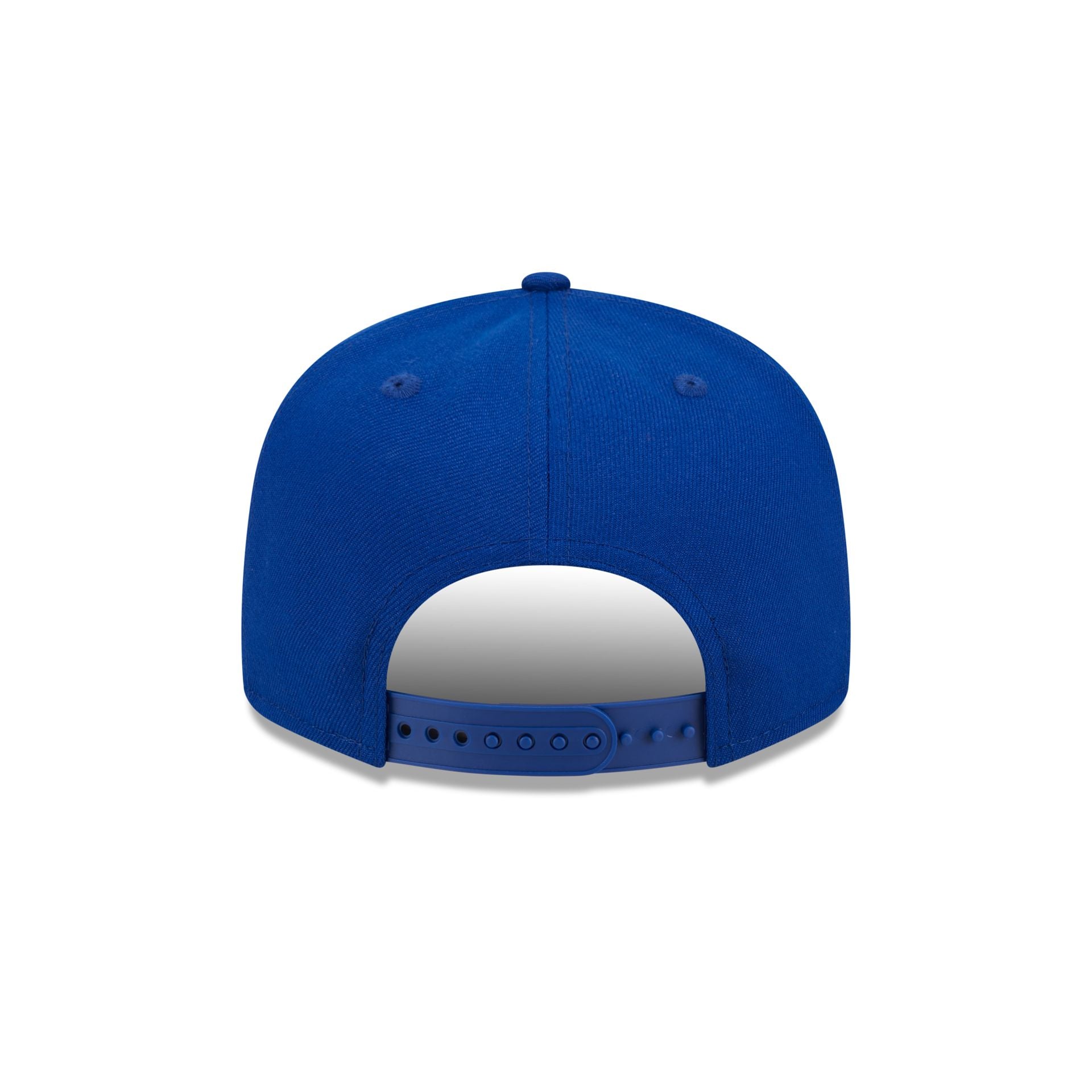 The Kansas City Royals Wordmark 9FIFTY Snapback features an embroidered Royals wordmark at the front panels with a matching team logo at the right-wear side. a gray undervisor. and a snapback closure at the rear.