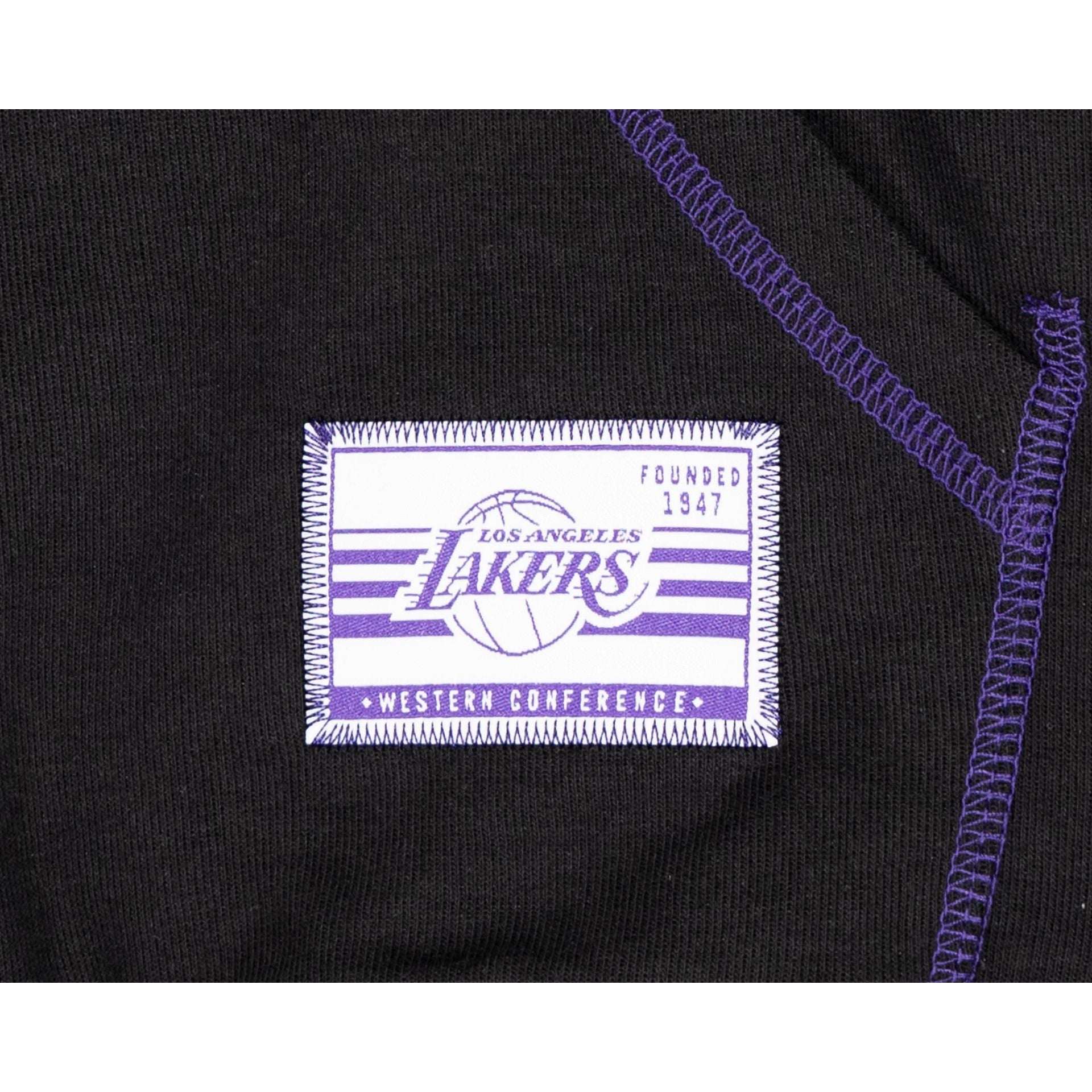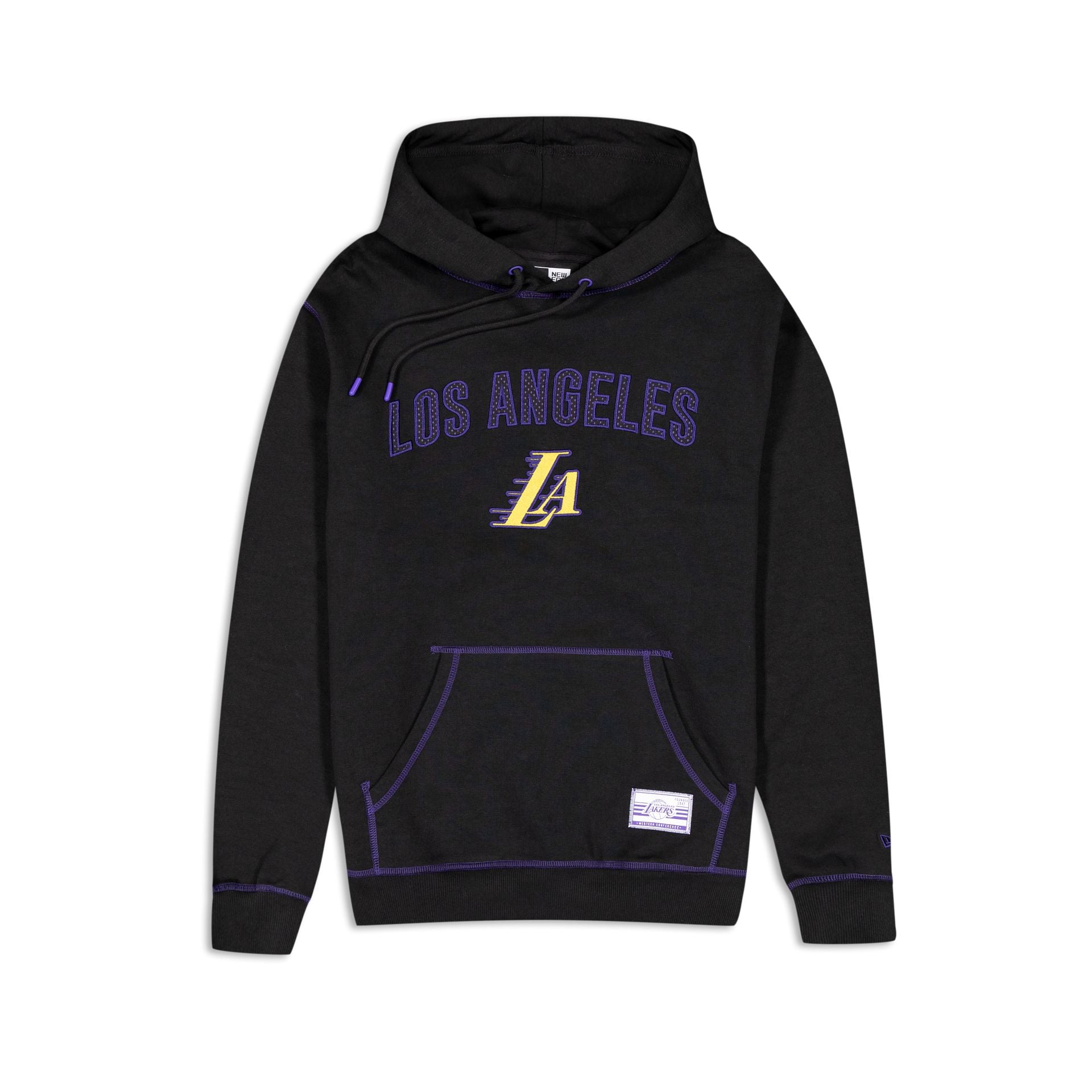 The Los Angeles Lakers 2023 City Edition Black Hoodie features a mesh applique Lakers wordmark and embroidered team logo at the chest with a team jock tag at the kangaroo pocket.