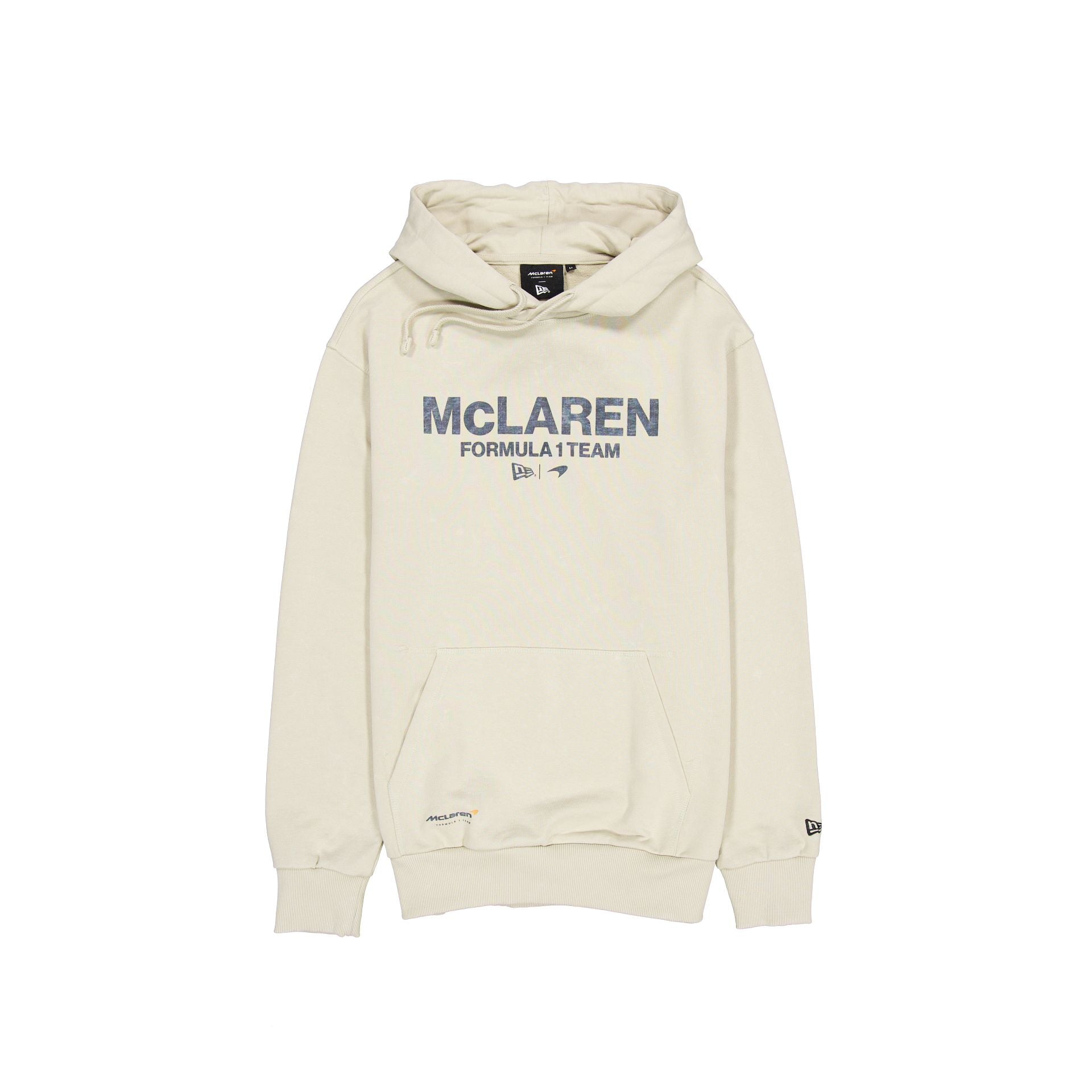 The McLaren Formula 1 Team Pigment Wash Stone Hoodie features a screen-printed McLaren wordmark at the front with kangaroo pockets and adjustable drawstrings at the hood.