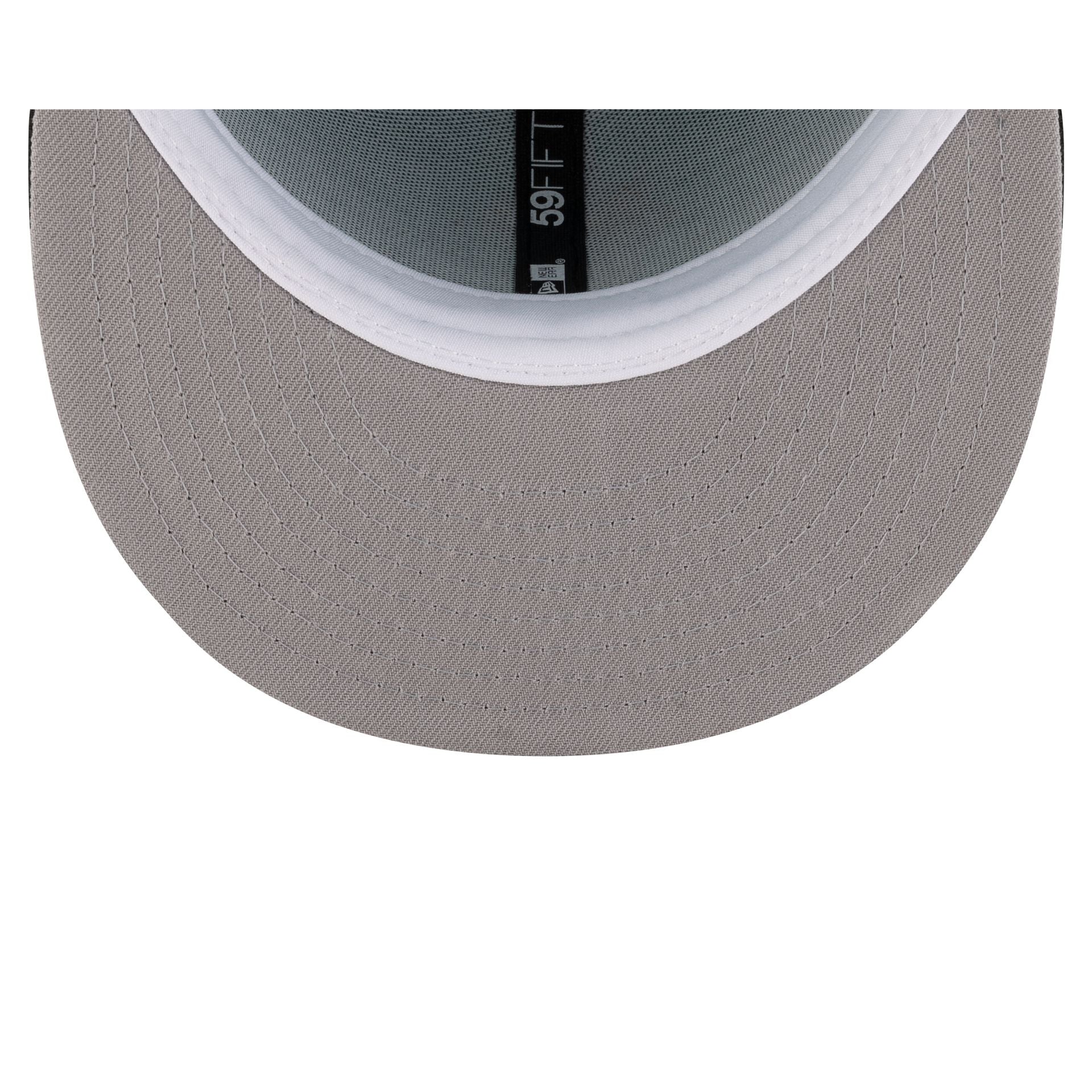 The Miami Marlins Mascot Blue 59FIFTY Fitted Cap features an embroidered Marlins mascot at the front panels with a matching MLB Batterman logo at the rear. Additional details include a 25th Anniversary patch at the right-wear side and a gray undervisor.