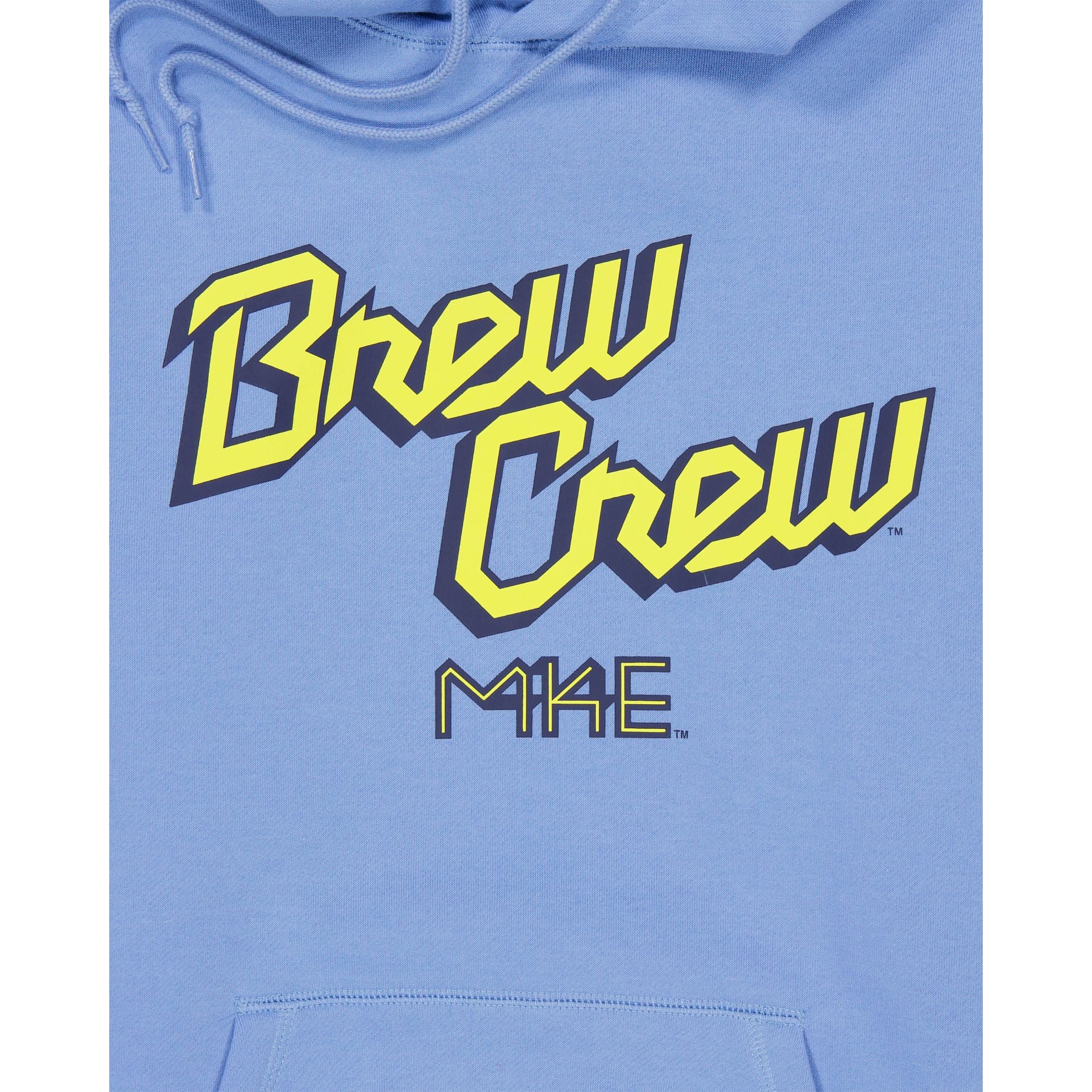 Jersey inspired. city connected. The Milwaukee Brewers City Connect Blue Hoodie features a screen-printed Brewers wordmark and logo at the front with an alternate team logo at the left-wear sleeve.