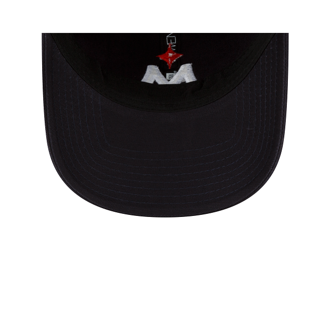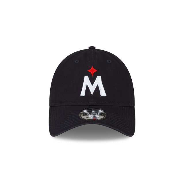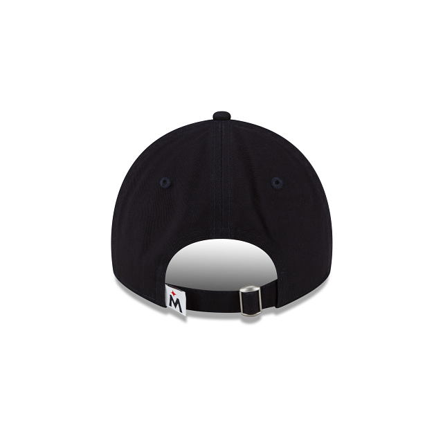 The Minnesota Twins Core Classic Road 9TWENTY Adjustable Cap features an embroidered Twins logo at the front panels with a woven tab displaying the team logo on an adjustable D-Ring closure at the rear.