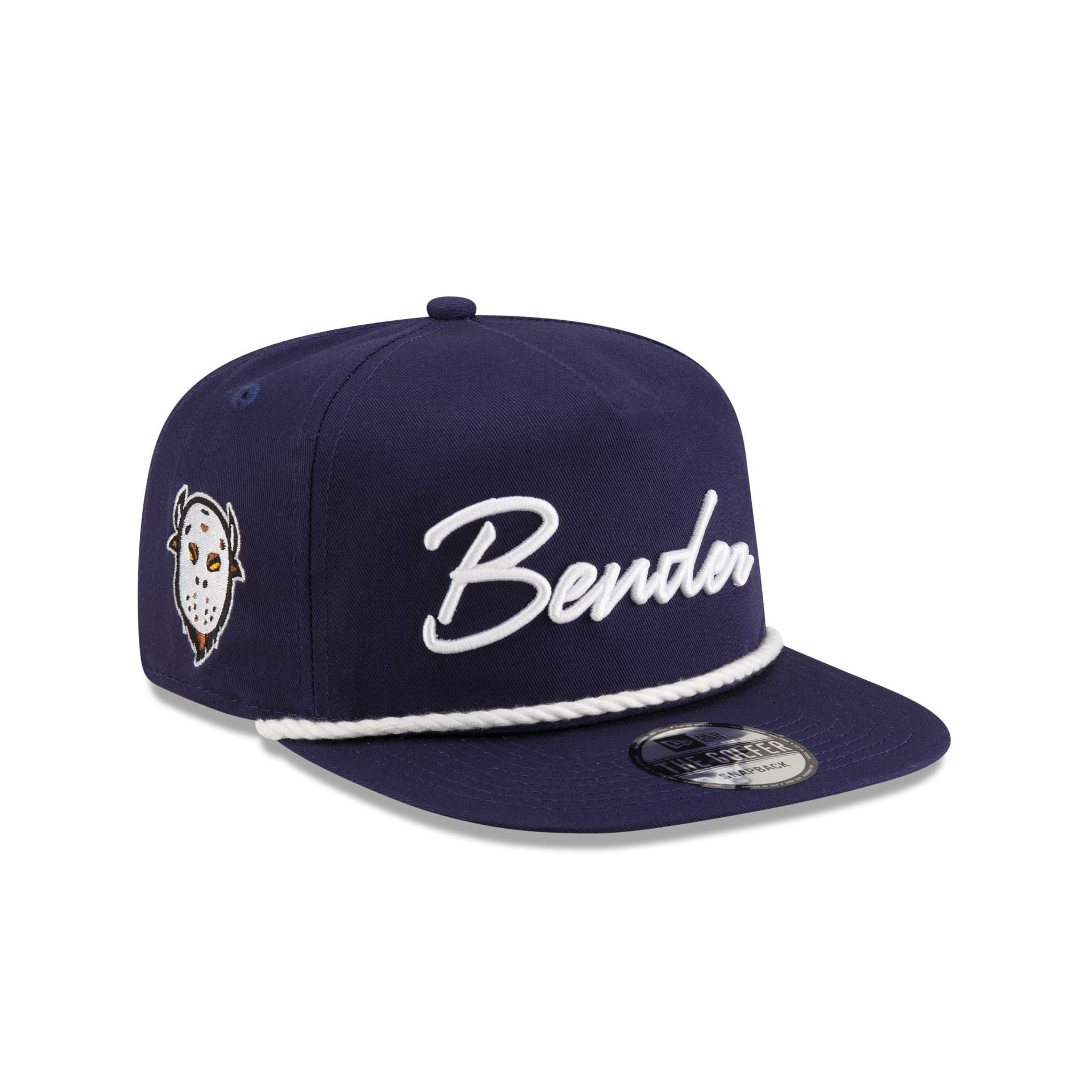 The New Era Cap Bender Golfer Hat features an embroidered Bender script at the front panels with a Buffalo patch at the right-wear side and a blue undervisor.
