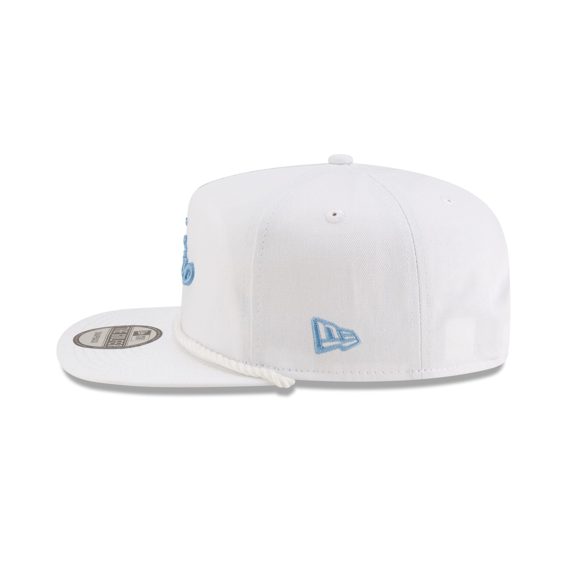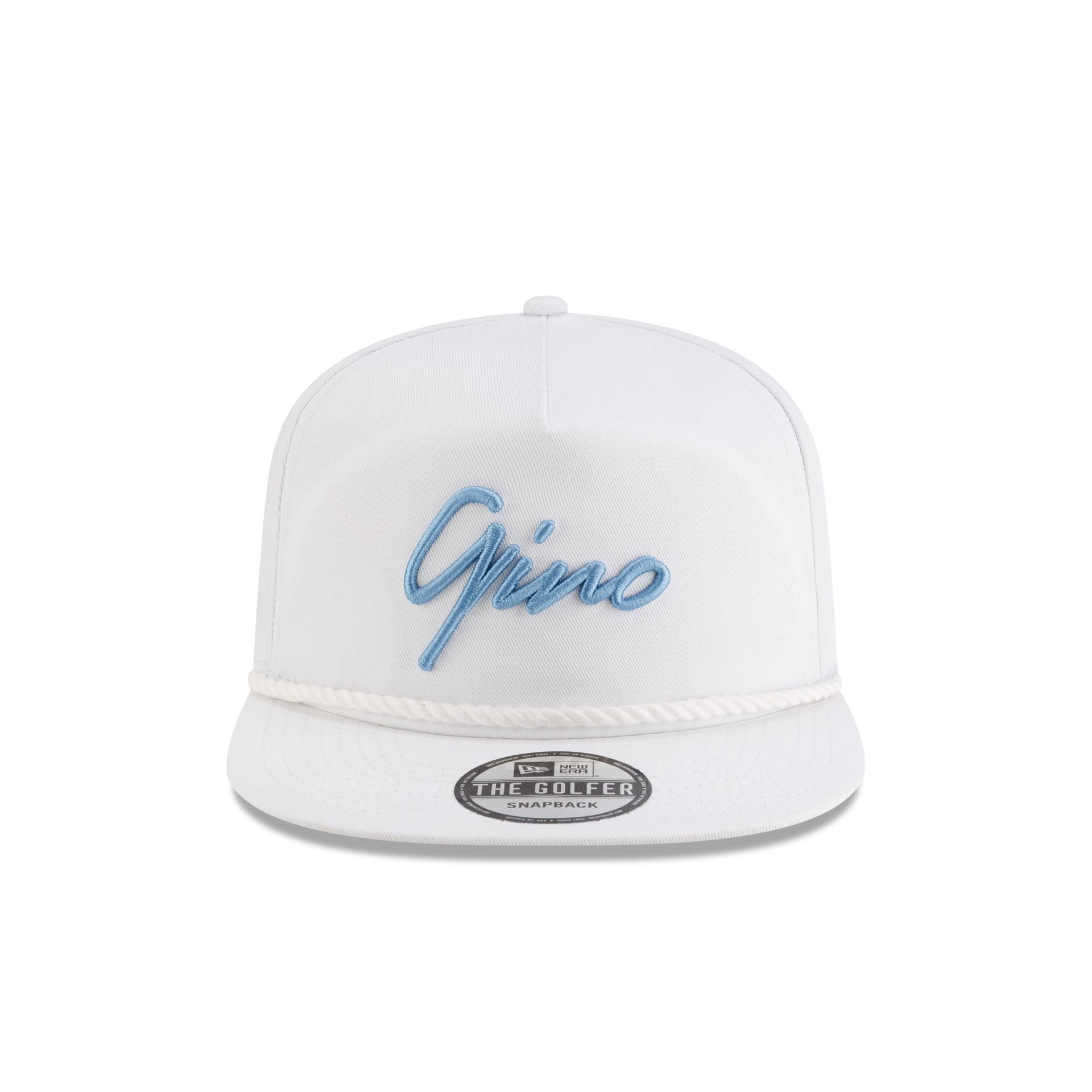 The New Era Cap Gino Golfer Hat features an embroidered Gino script at the front panels with a Buffalo patch at the right-wear side and a blue undervisor