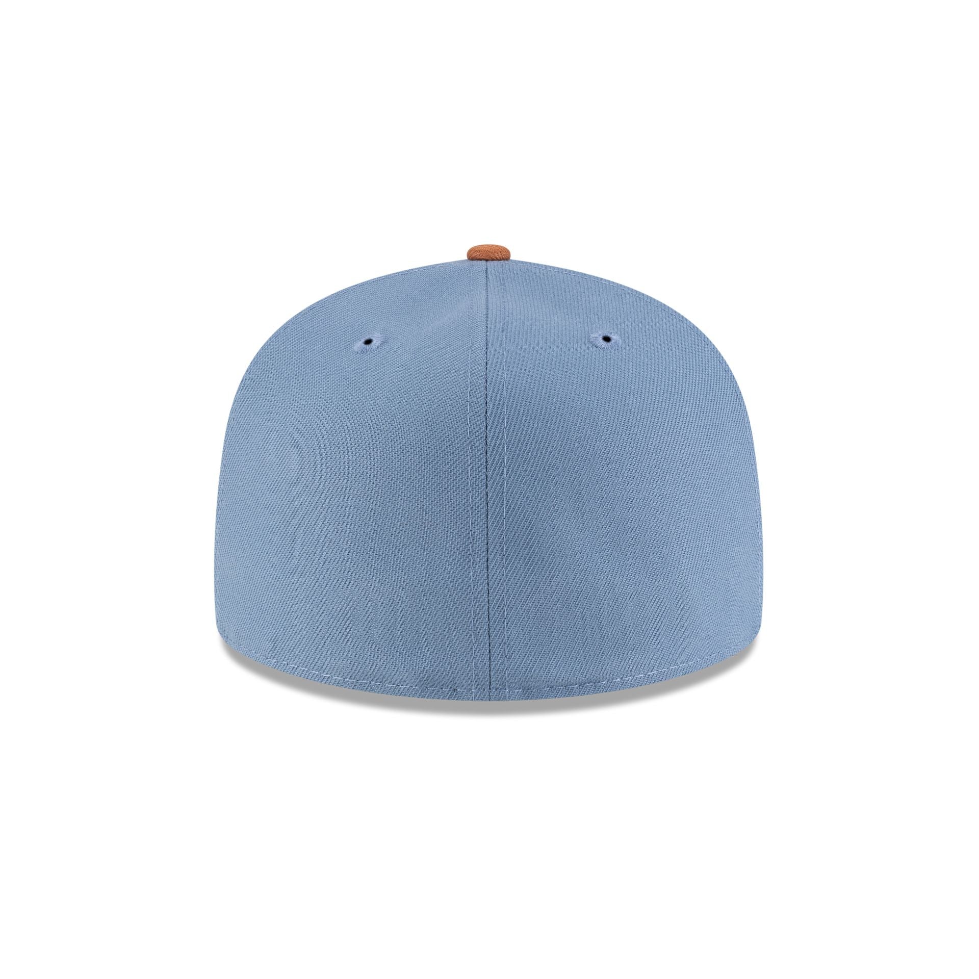 The New Era Cap Watermelon 59FIFTY Fitted Cap features an embroidered watermelon slice icon at the front panels with New Era Flag at the left-wear side. a brown visor. and a gray undervisor.