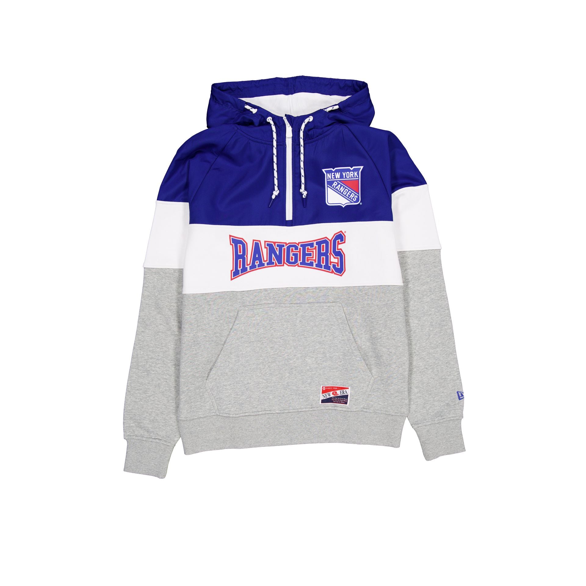 The New York Rangers Throwback Color Block Hoodie features a screen-printed Rangers logo and team wordmark at the front with a quarter zip closure at the collar.