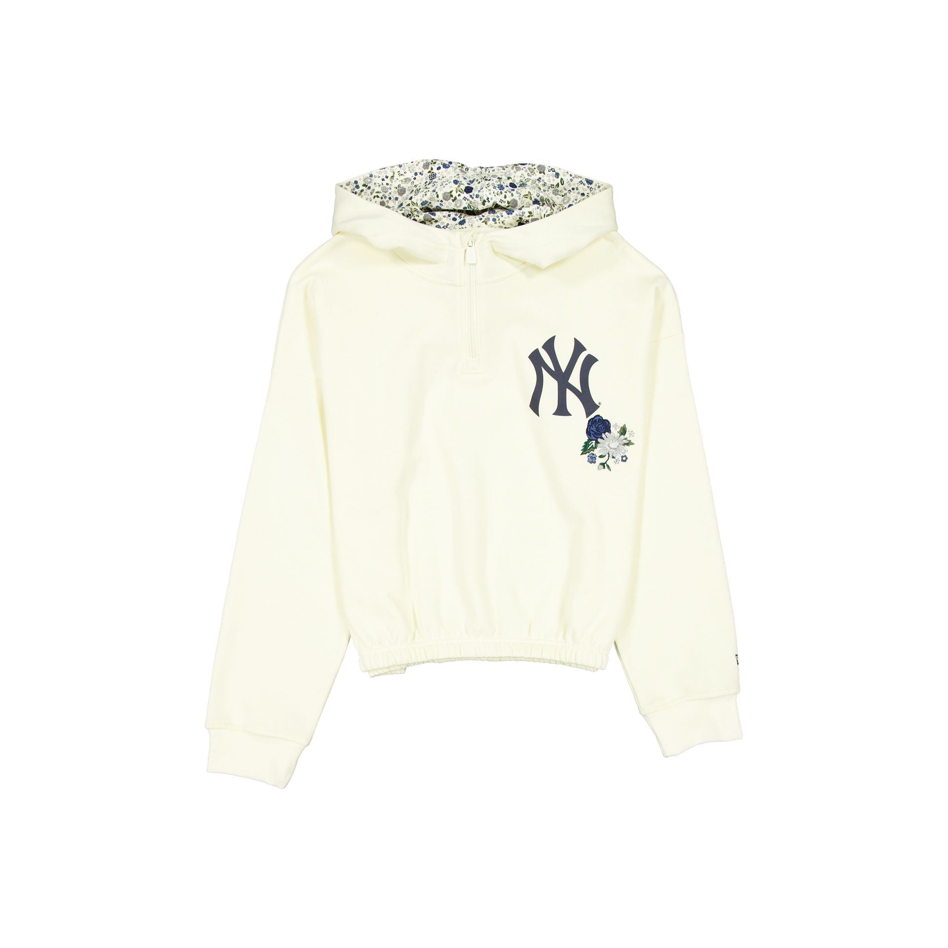 The New York Yankees Glam Game Women’s Hoodie features a screen-printed Yankees logo at the left chest with matching embroidered flowers. Additional details include a zipper closure and a floral lining.