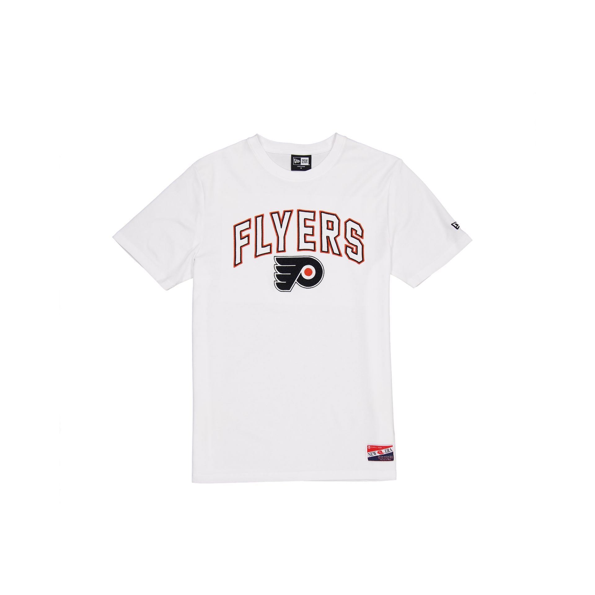 The Philadelphia Flyers Throwback White T-Shirt features an embroidered Flyers wordmark above an embroidered team logo at the front.