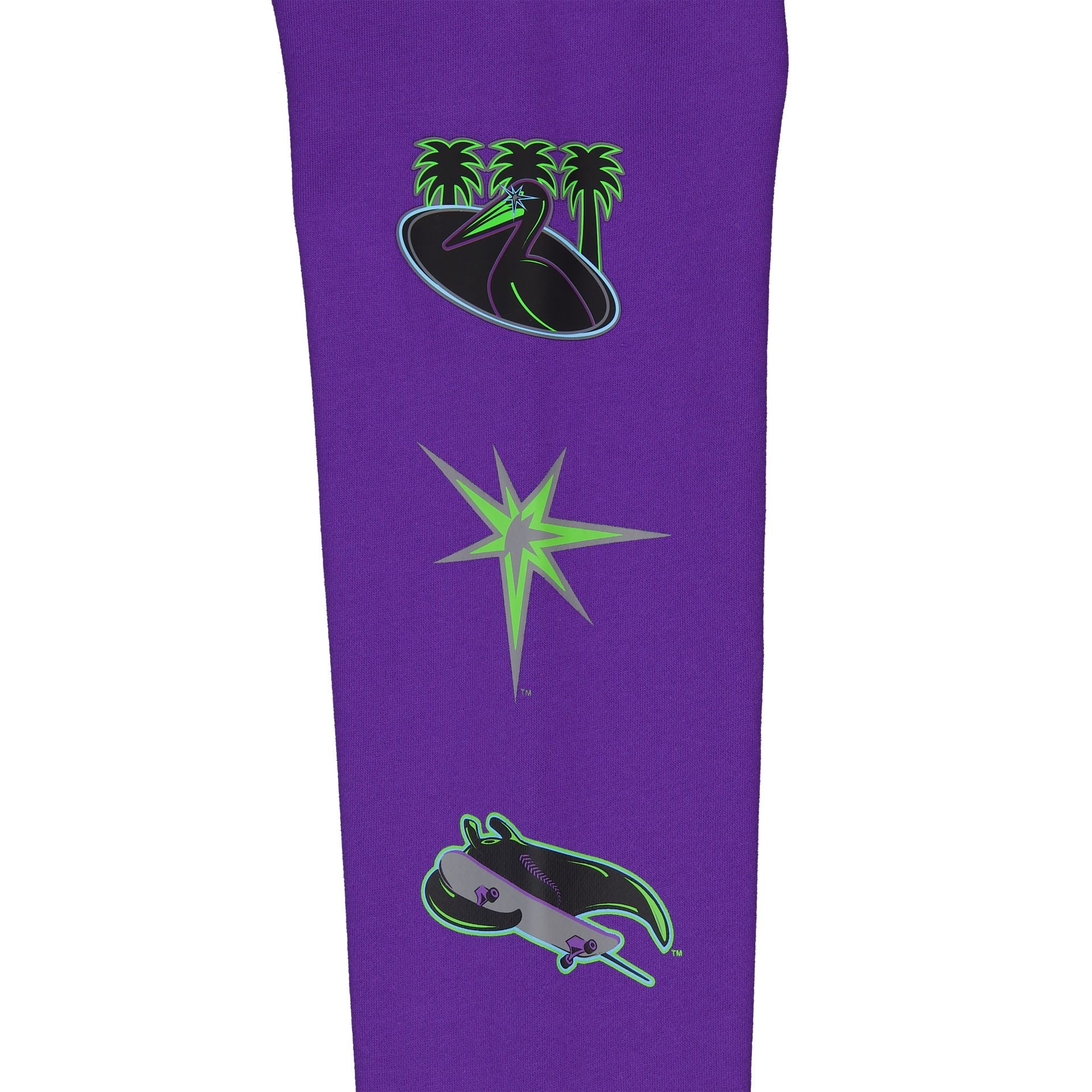 The Tampa Bay Rays City Connect Purple Hoodie features a screen-printed Rays wordmark at the front with alternate team logos at the left sleeve.
