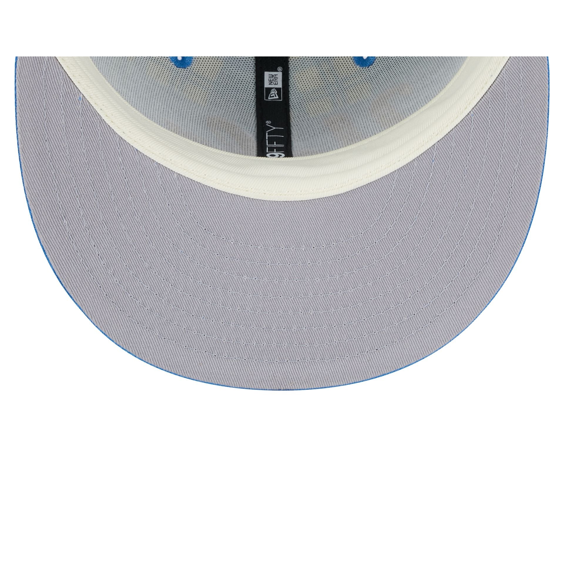 The UCLA Bruins Plaid 9FIFTY Snapback features an embroidered Bruins logo at the front panels against a matching plaid pattern. Additional details include a team logo above a snapback closure at the rear and a gray undervisor.
