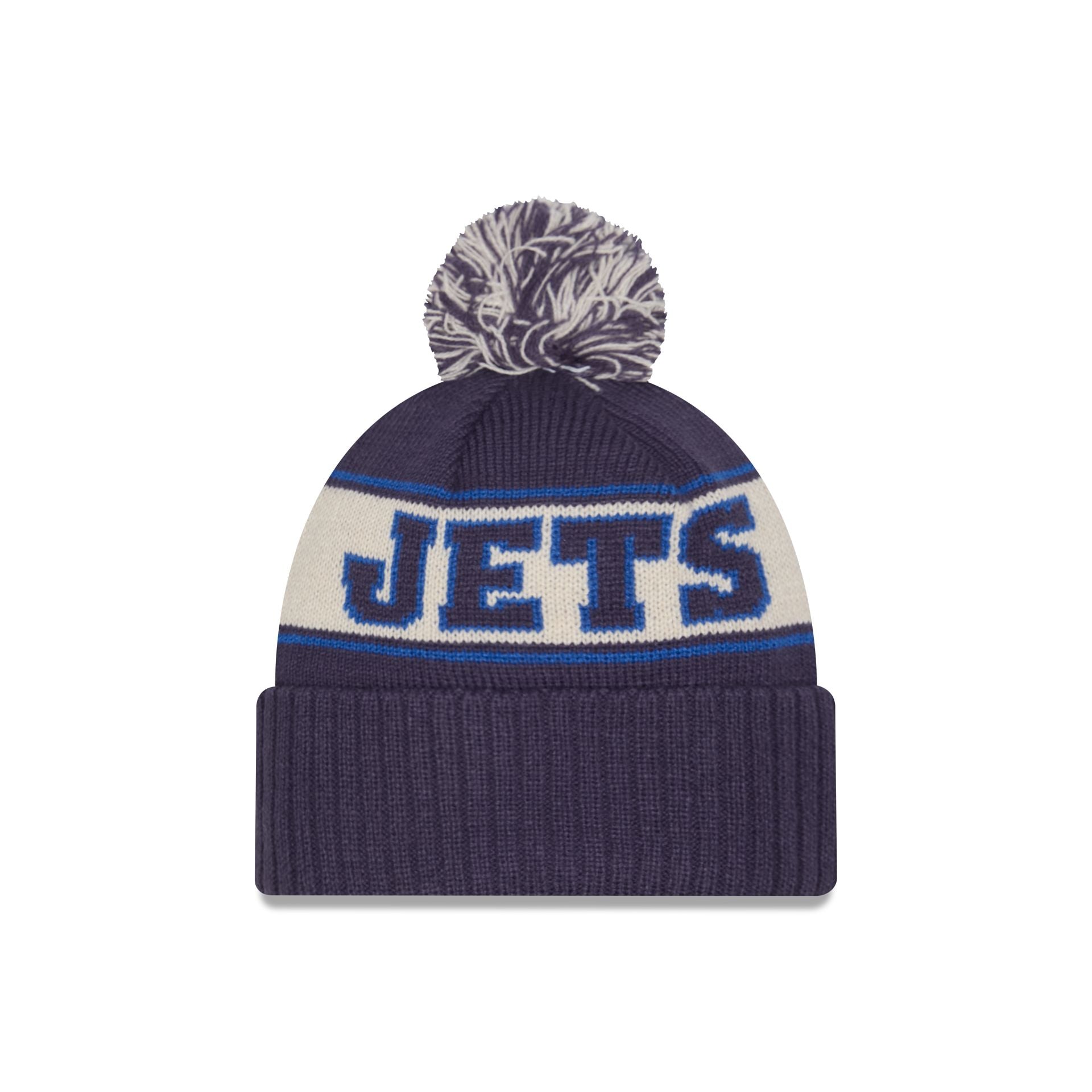 The Winnipeg Jets Retro Pom Knit Hat features an embroidered Jets logo at the front cuff with a team wordmark at the crown and a one-time removable pom.