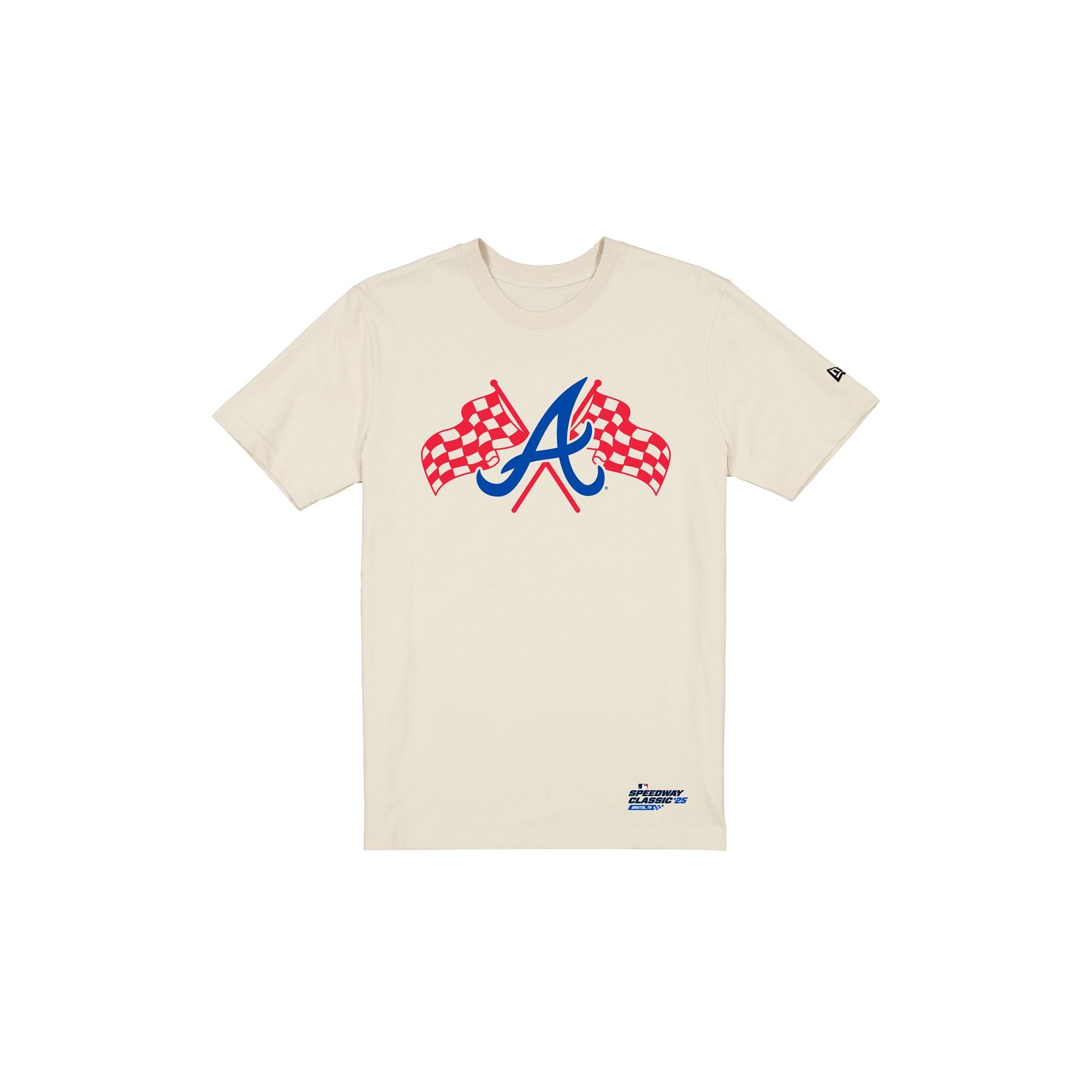 The Atlanta Braves Speedway Classic White T-Shirt features a screen-printed Braves logo and red racing flags at the chest with a Speedway Classic ’25 logo at the hem.