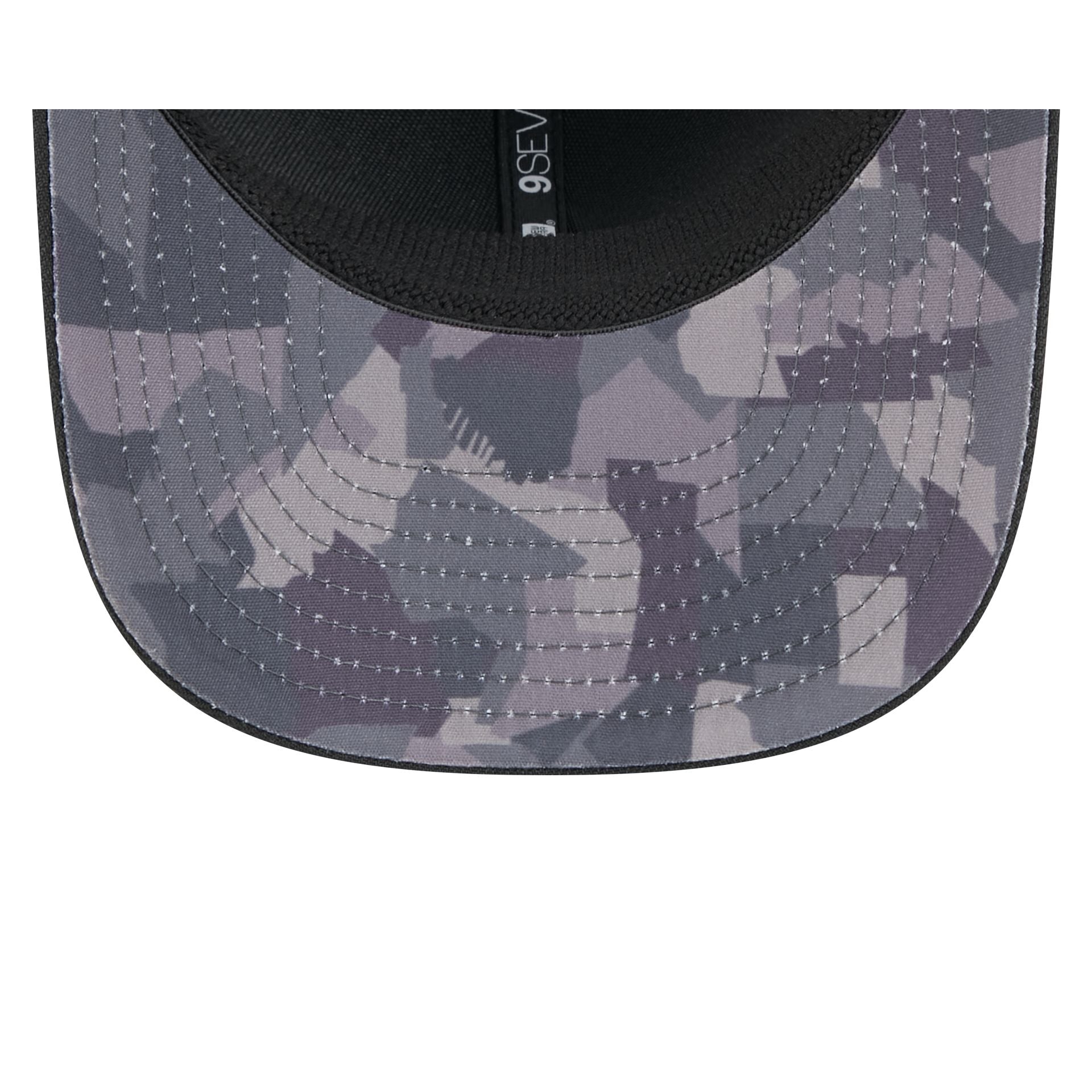 The Baltimore Orioles City Connect 9SEVENTY Stretch-Snap features an embroidered Orioles logo at the front panels with an MLB Batterman logo above a snapback closure at the rear and a camo undervisor.