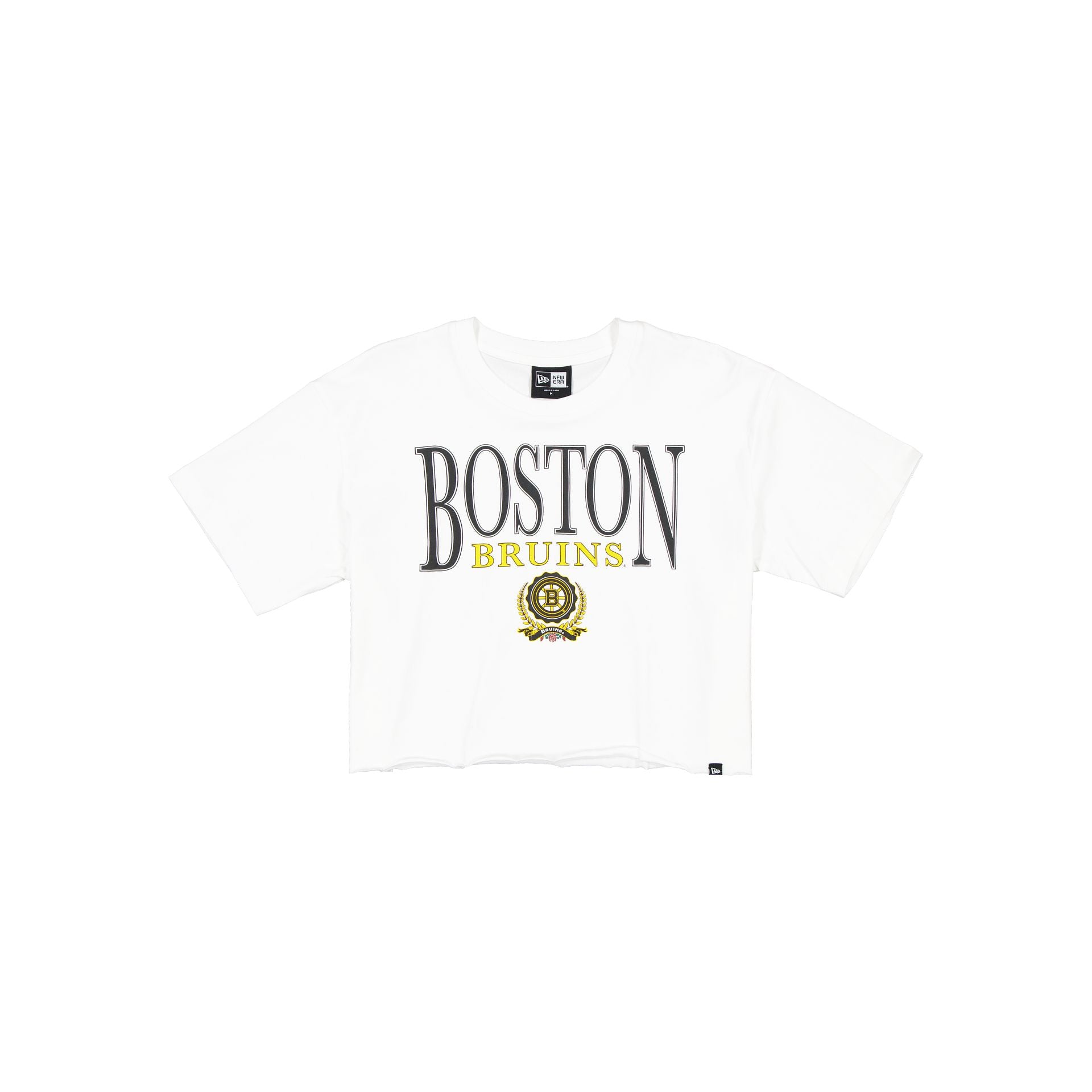 The Boston Bruins Throwback Prep Women’s Cropped T-Shirt features a screen-printed Bruins wordmark above a team emblem at the front.