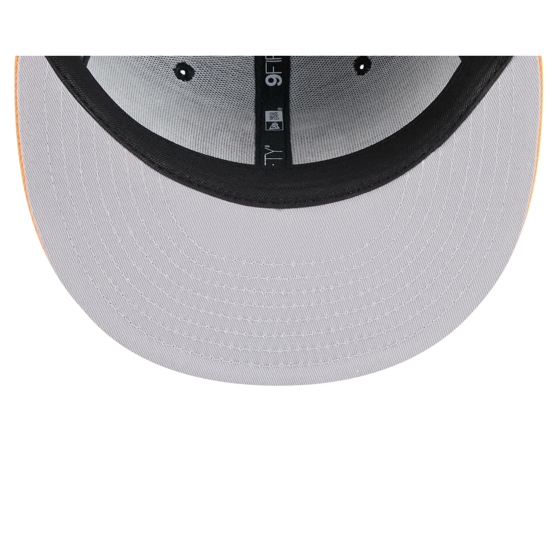 The Boston Bruins Team Color 9FIFTY Snapback features an embroidered Bruins logo at the front panels with a matching visor. a gray undervisor. and a snapback closure at the rear.