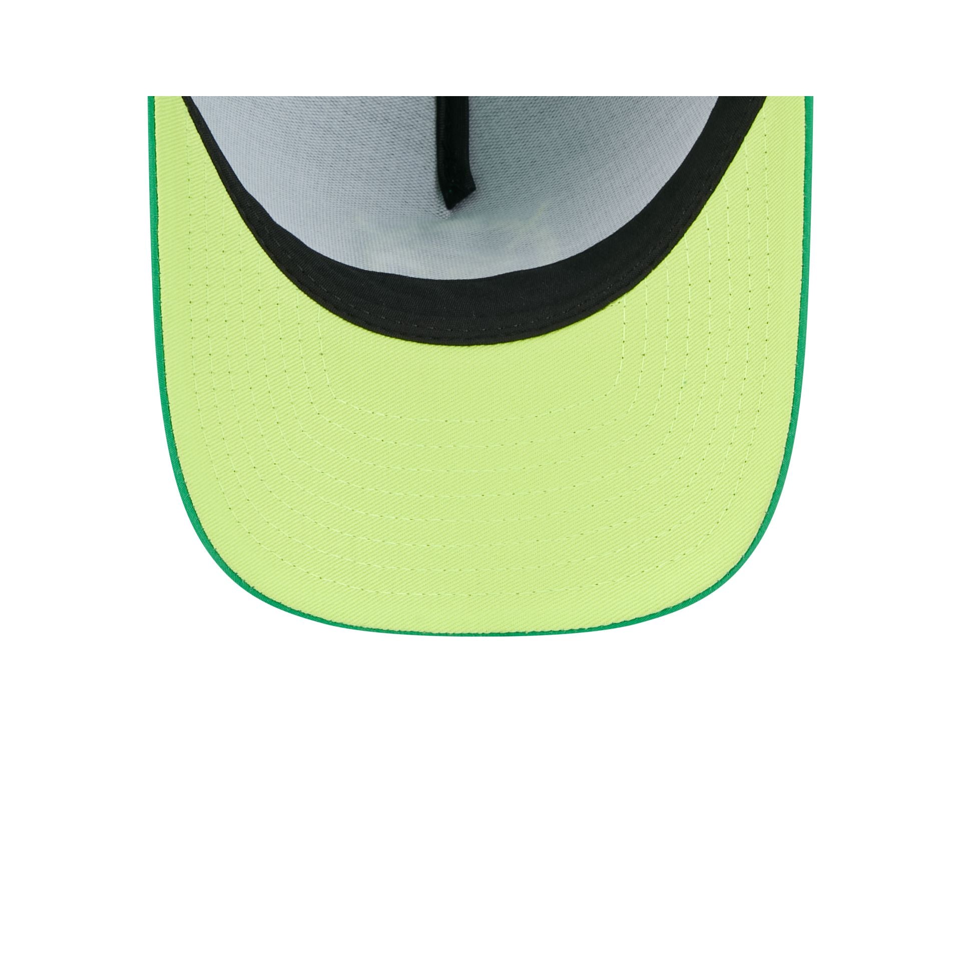 The Buffalo Bills Tee Time 9FORTY M-Crown A-Frame Snapback features an embroidered Bills golf logo at the front panels with a snapback closure at the rear and a neon green undervisor.