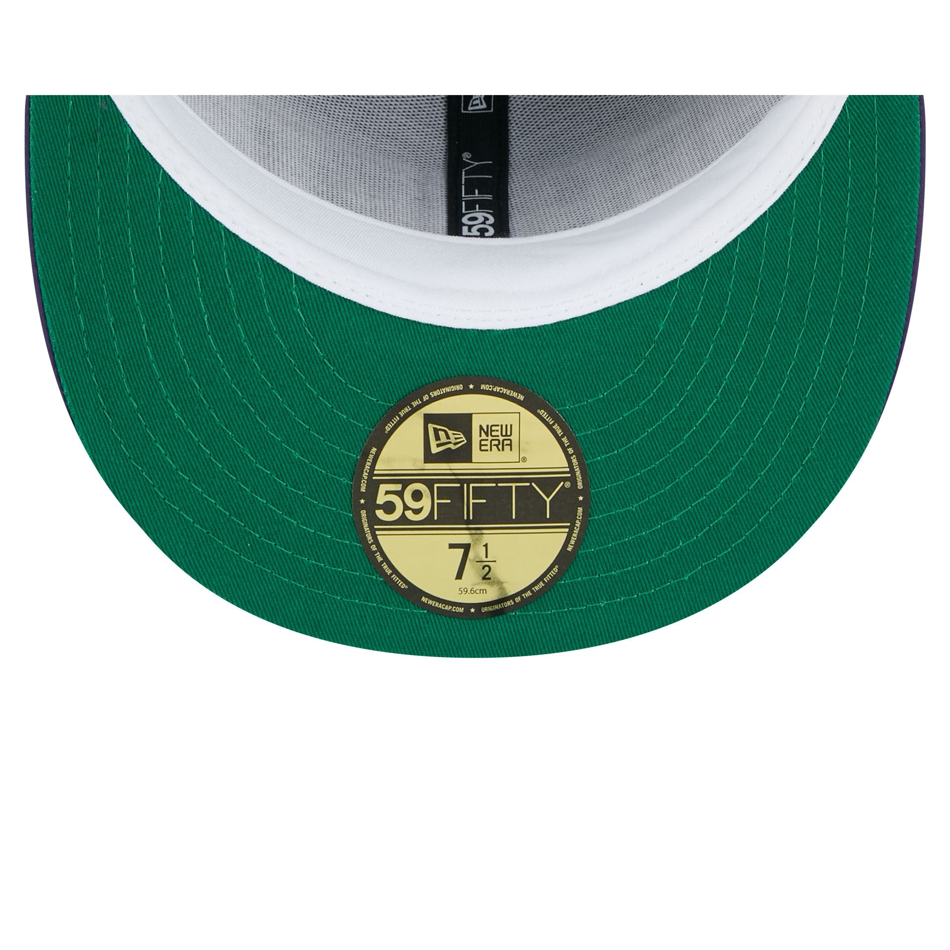 The Charlotte Hornets Spring Satin 59FIFTY Fitted Cap features an embroidered Hornets wordmark at the front panels with a New Era pin at the top left panel and an NBA Logoman at the rear. Additional details include a satin fabrication throughout. a logo at the right-wear side. and a green undervisor.