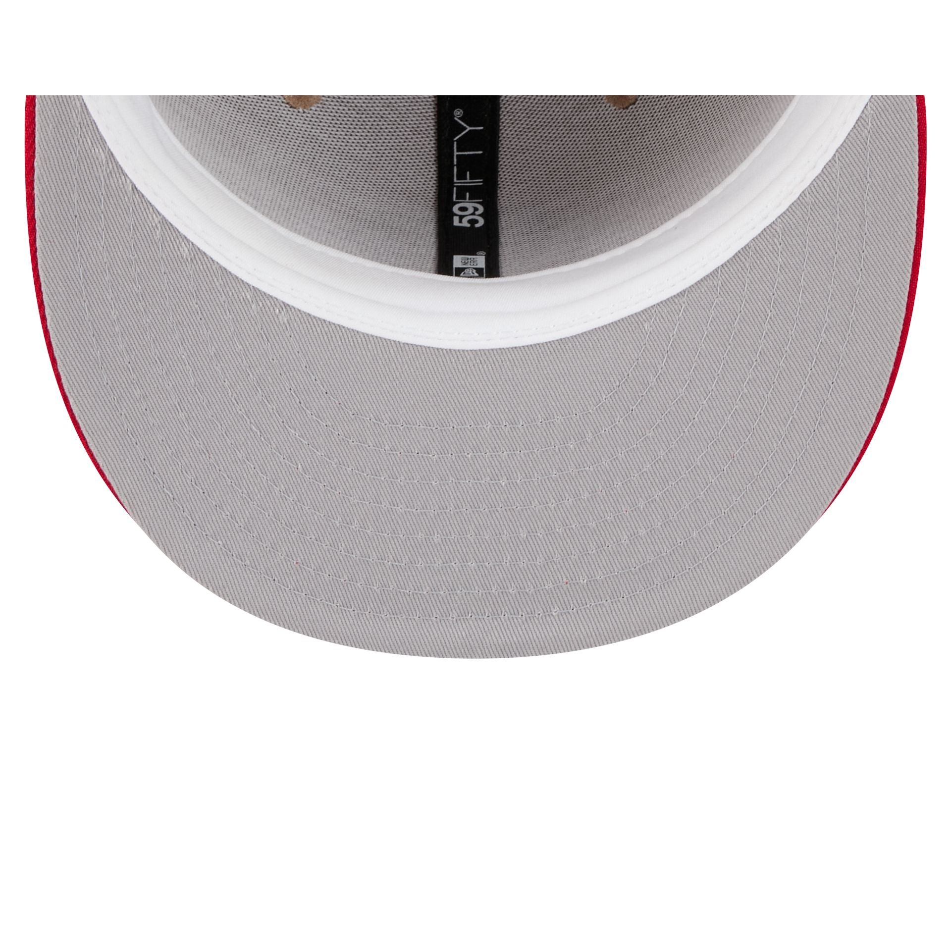 The Chicago Blackhawks Camel 59FIFTY Fitted Cap features an embroidered Blackhawks logo at the front panels with a matching NHL Shield at the rear. a team color visor. and a gray undervisor.