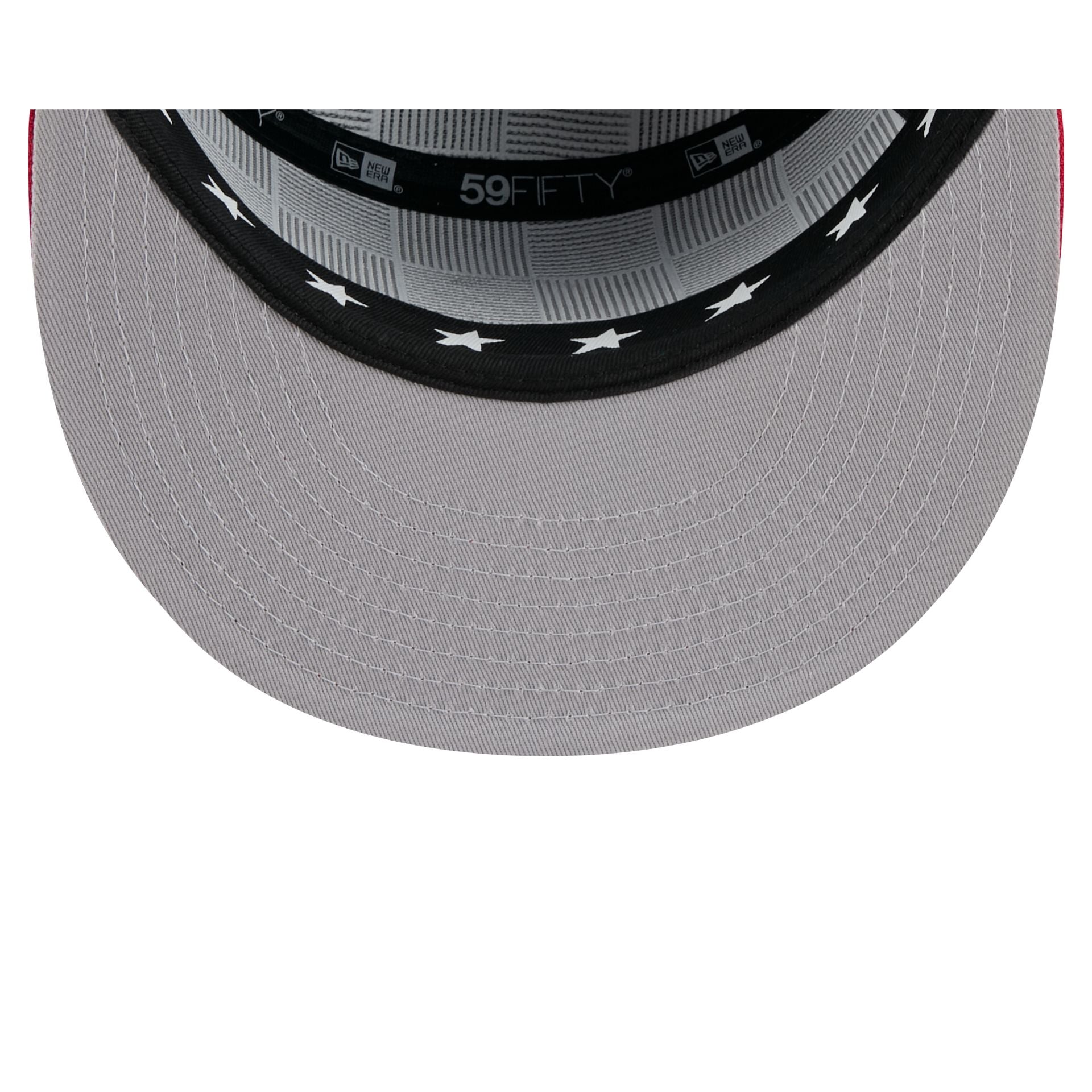 The Chicago Cubs 2025 All-Star Game Split Panel 59FIFTY Fitted Cap features an embroidered Cubs logo at the front panels against a split-crown construction with breathable mesh fabric at the side and rear panels. Additional details include stars at the top panel. a 2025 All-Star Game patch at the right-wear side. the MLB Batterman logo at the rear. and a gray undervisor. The cap also features screen-printed stars on the sweatband.