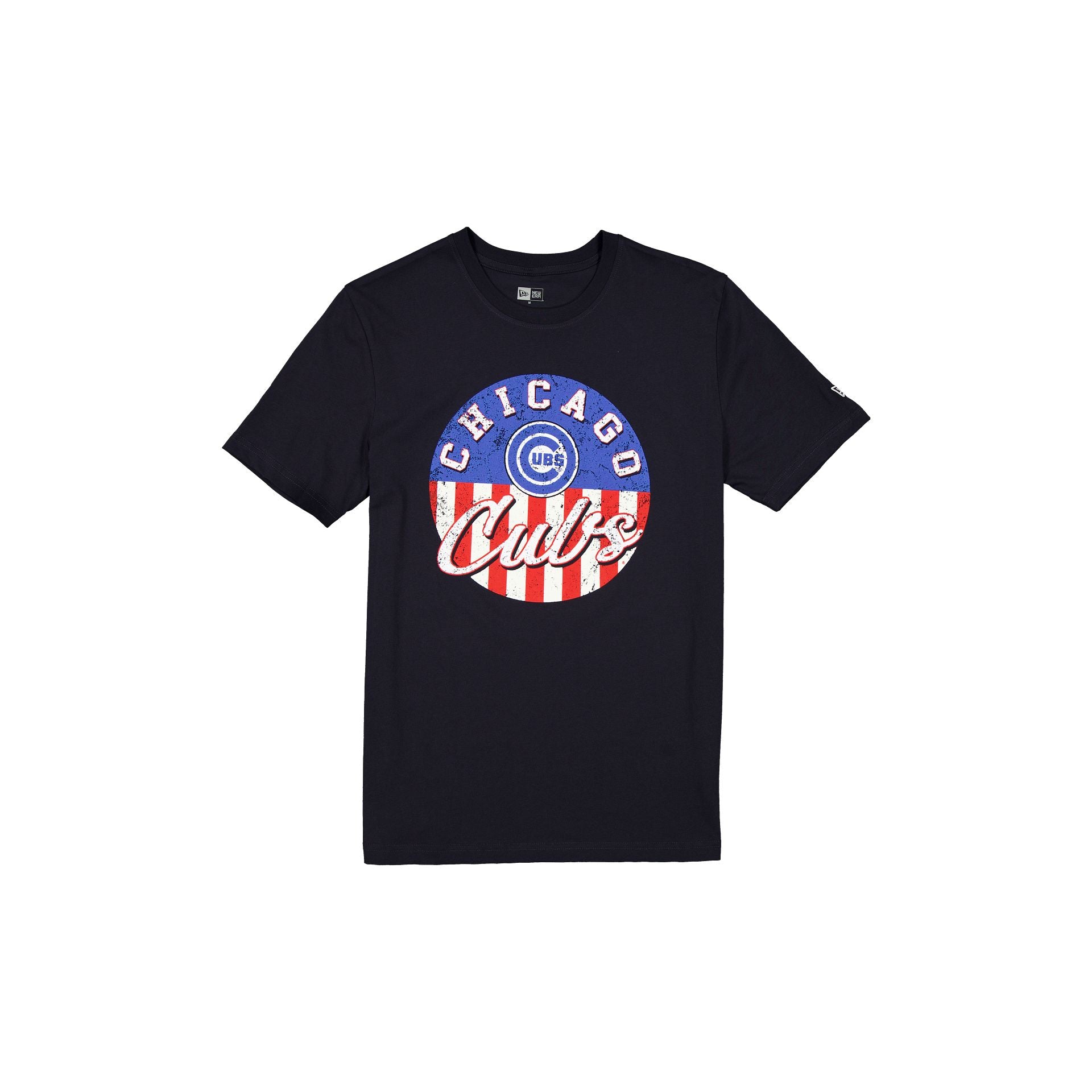 The Chicago Cubs Independence Day 2025 Navy T-Shirt a screen-printed American flag themed Cubs graphic at the front.