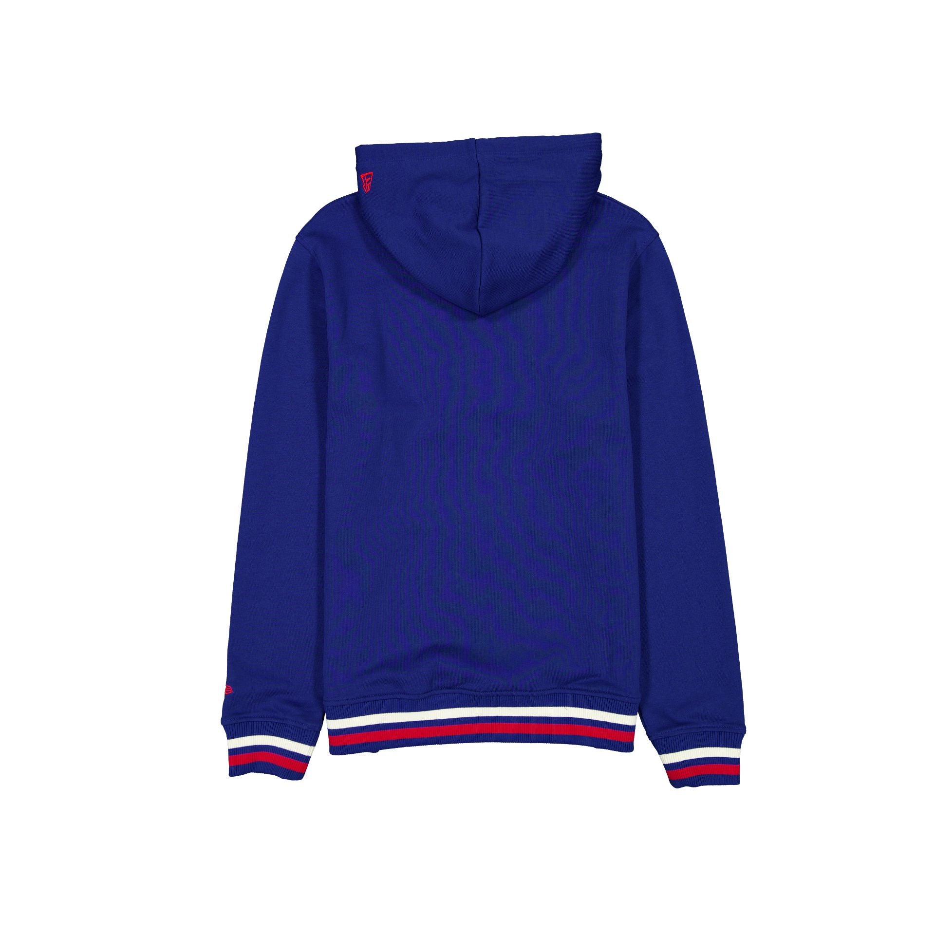 The Chicago Cubs Throwback Hoodie features a felt applique Cubs wordmark at the front with kangaroo pockets. adjustable drawstrings at the hood. and a New Era jock tag at the left pocket.