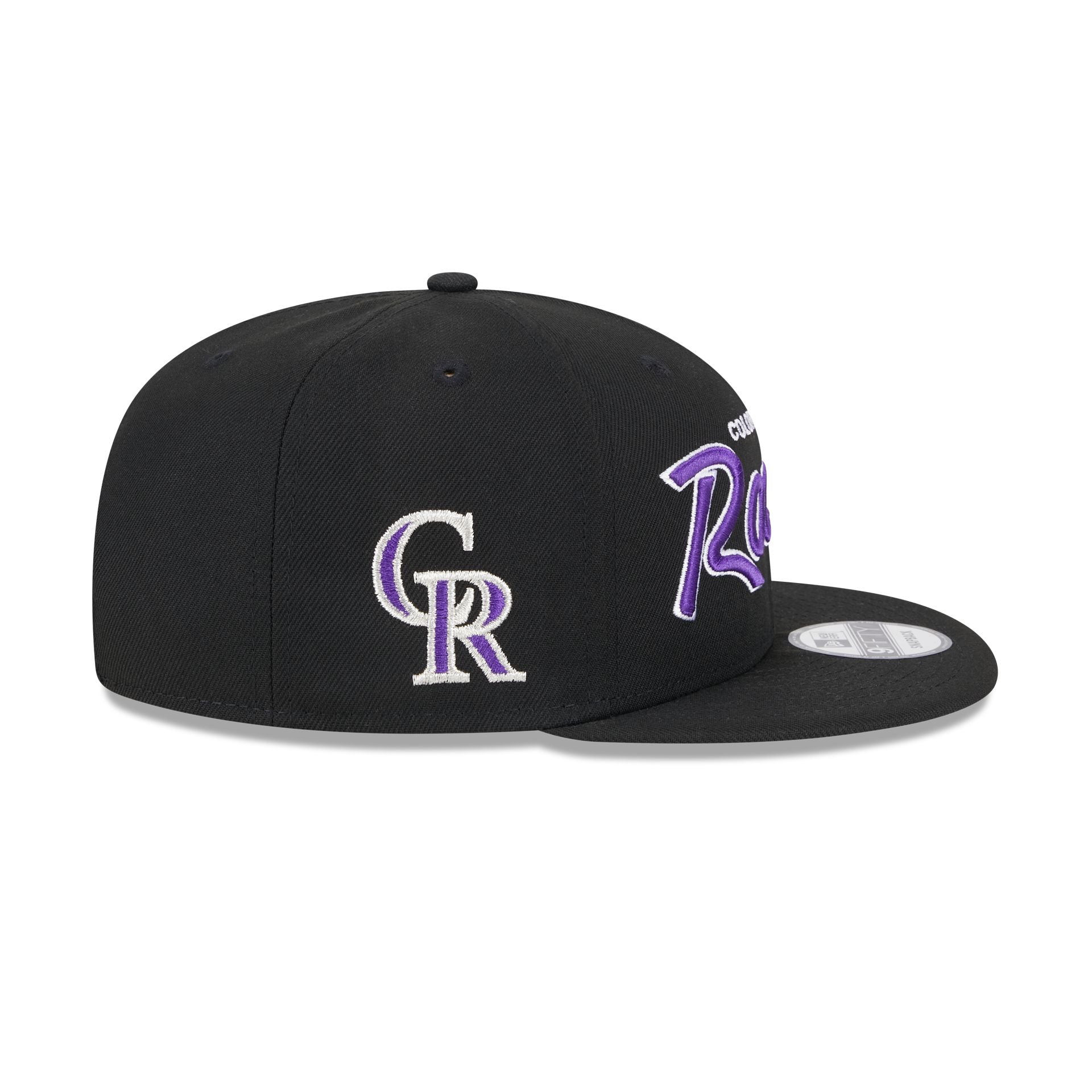 The Colorado Rockies Wordmark 9FIFTY Snapback features an embroidered Rockies wordmark at the front panels with a matching team logo at the right-wear side. a gray undervisor. and a snapback closure at the rear.