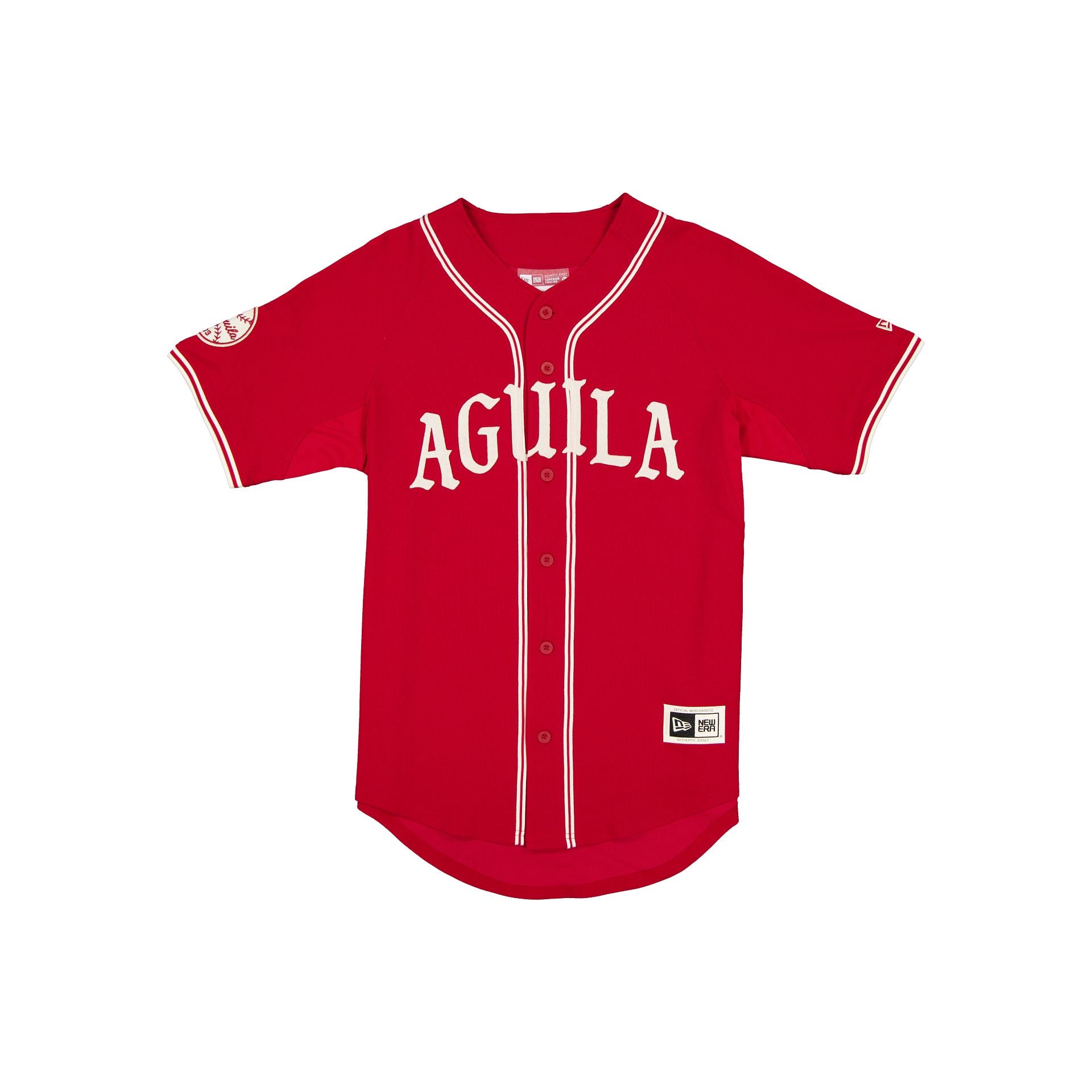 The El Águila de Veracruz Retro Jersey features an embroidered El Águila applique logo at the chest with a New Era Official Merchandise patch at the front. a team patch at the right-wear sleeve. and a LMB logo at the rear.