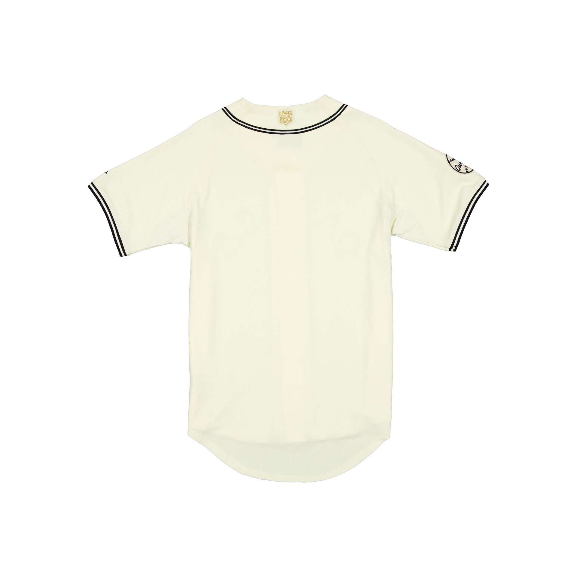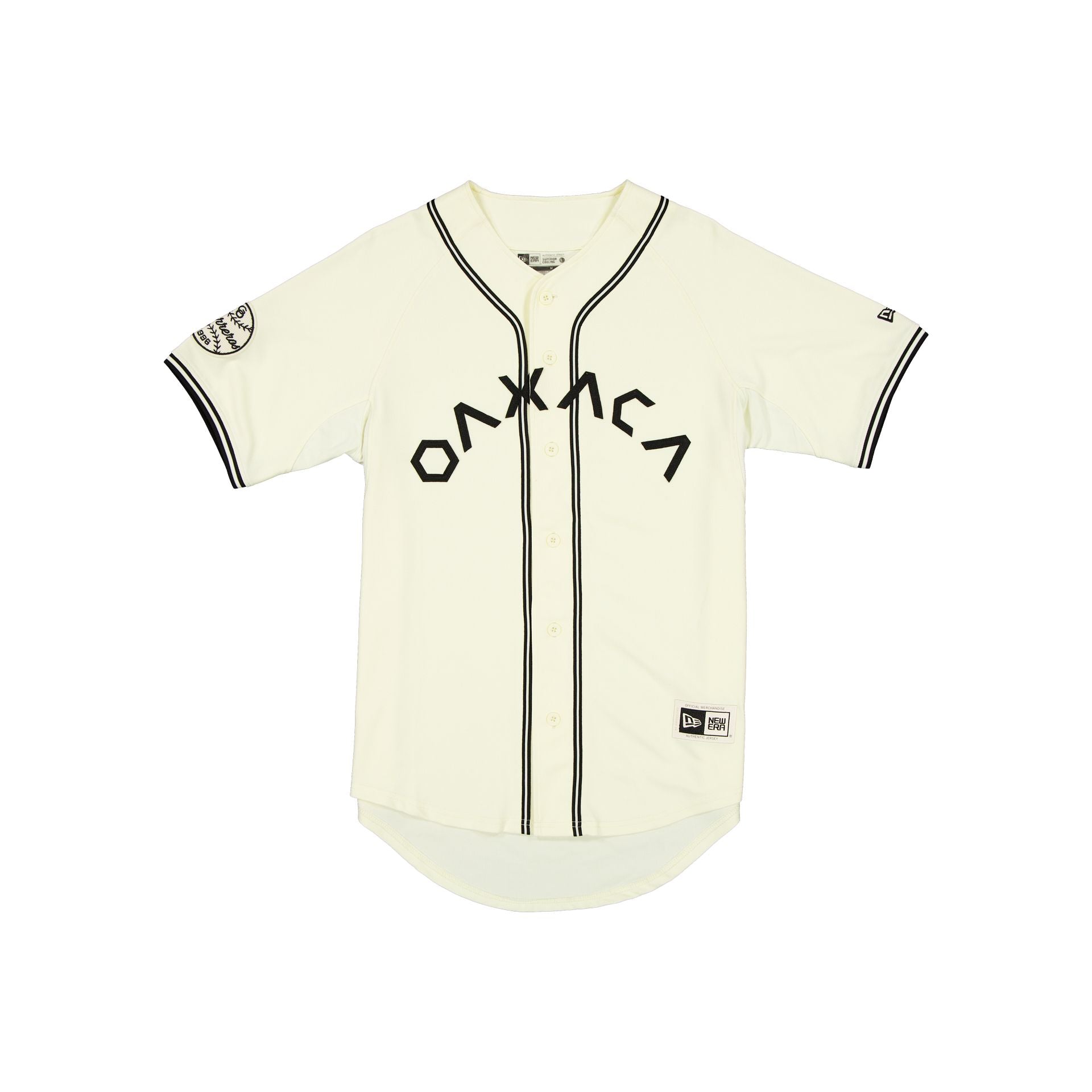 The Guerreros de Oaxaca Retro Jersey features an embroidered Guerreros applique logo at the chest with a New Era Official Merchandise patch at the front. a team patch at the right-wear sleeve. and a LMB logo at the rear.