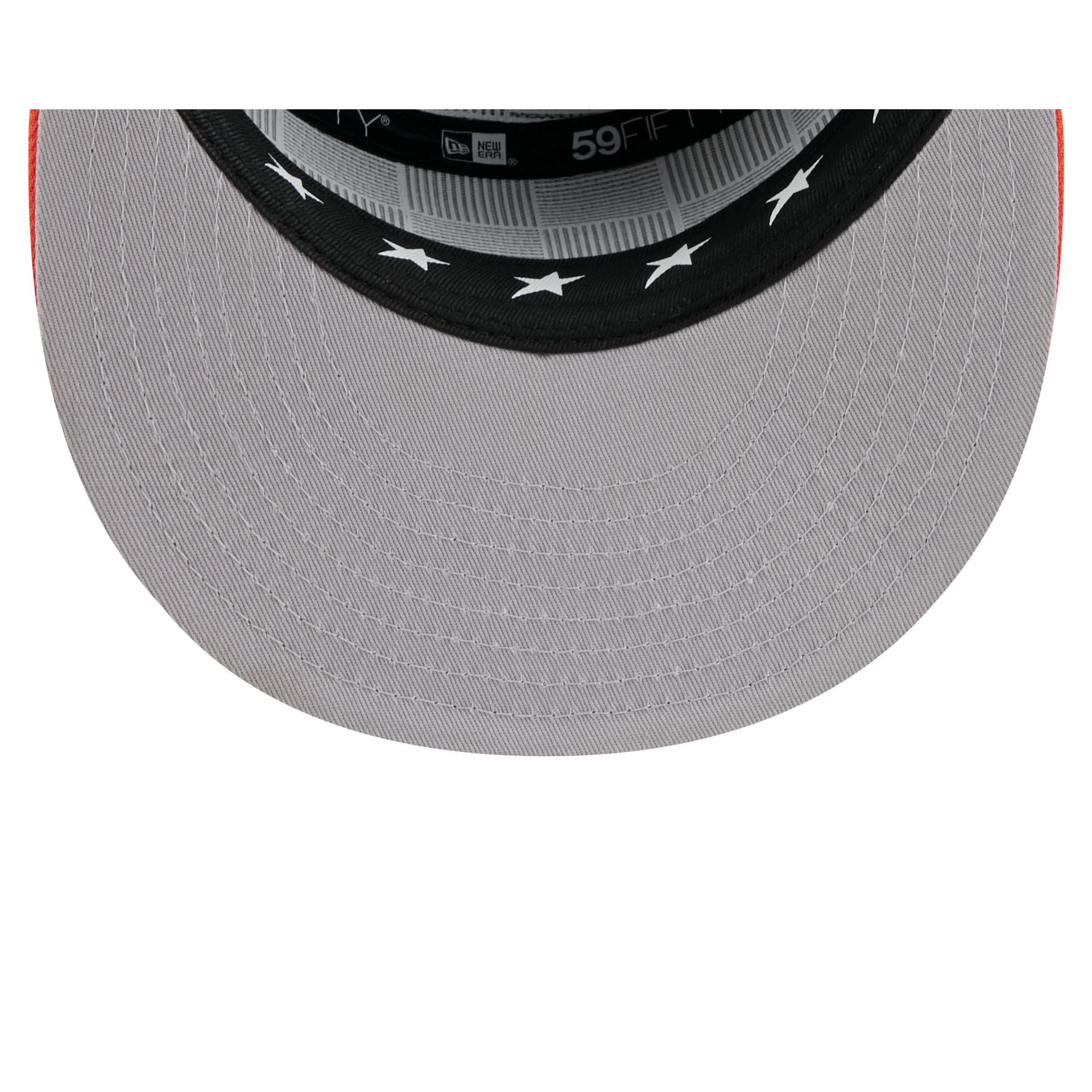 The Houston Astros 2025 All-Star Game Split Panel 59FIFTY Fitted Cap features an embroidered Astros logo at the front panels against a split-crown construction with breathable mesh fabric at the side and rear panels. Additional details include stars at the top panel. a 2025 All-Star Game patch at the right-wear side. the MLB Batterman logo at the rear. and a gray undervisor. The cap also features screen-printed stars on the sweatband.