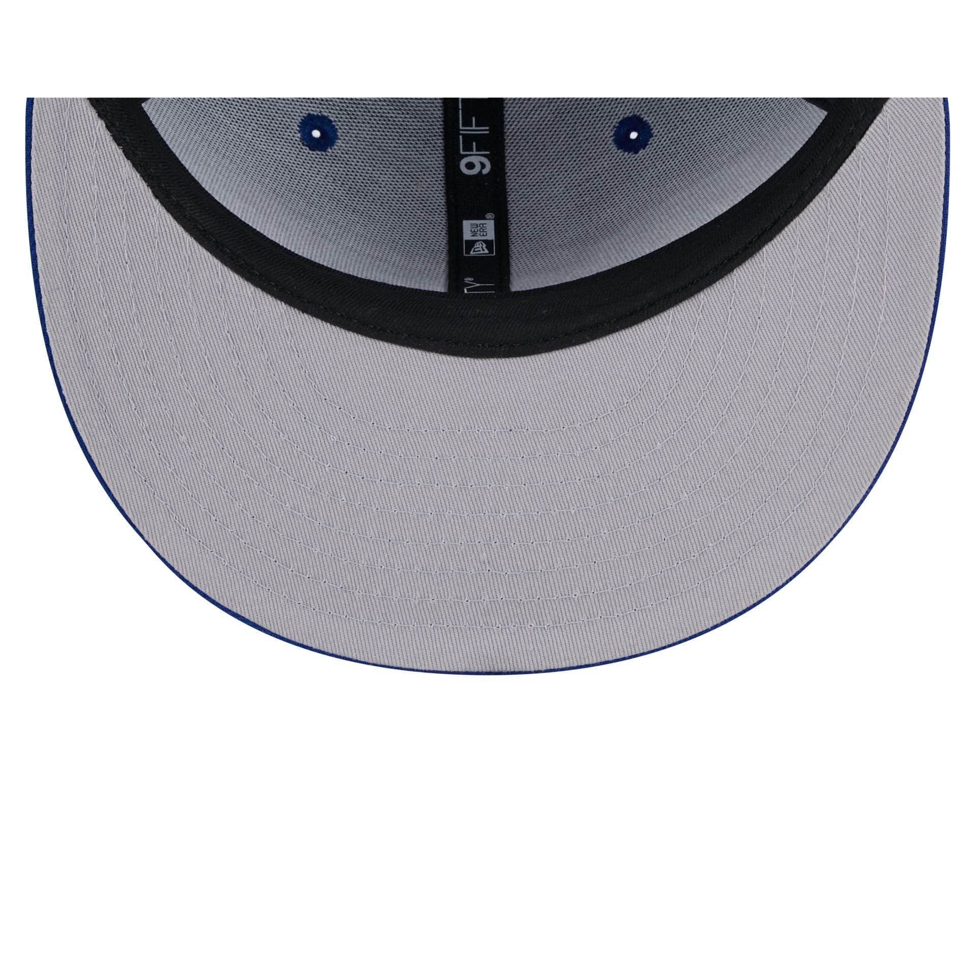 The Kansas City Royals Wordmark 9FIFTY Snapback features an embroidered Royals wordmark at the front panels with a matching team logo at the right-wear side. a gray undervisor. and a snapback closure at the rear.