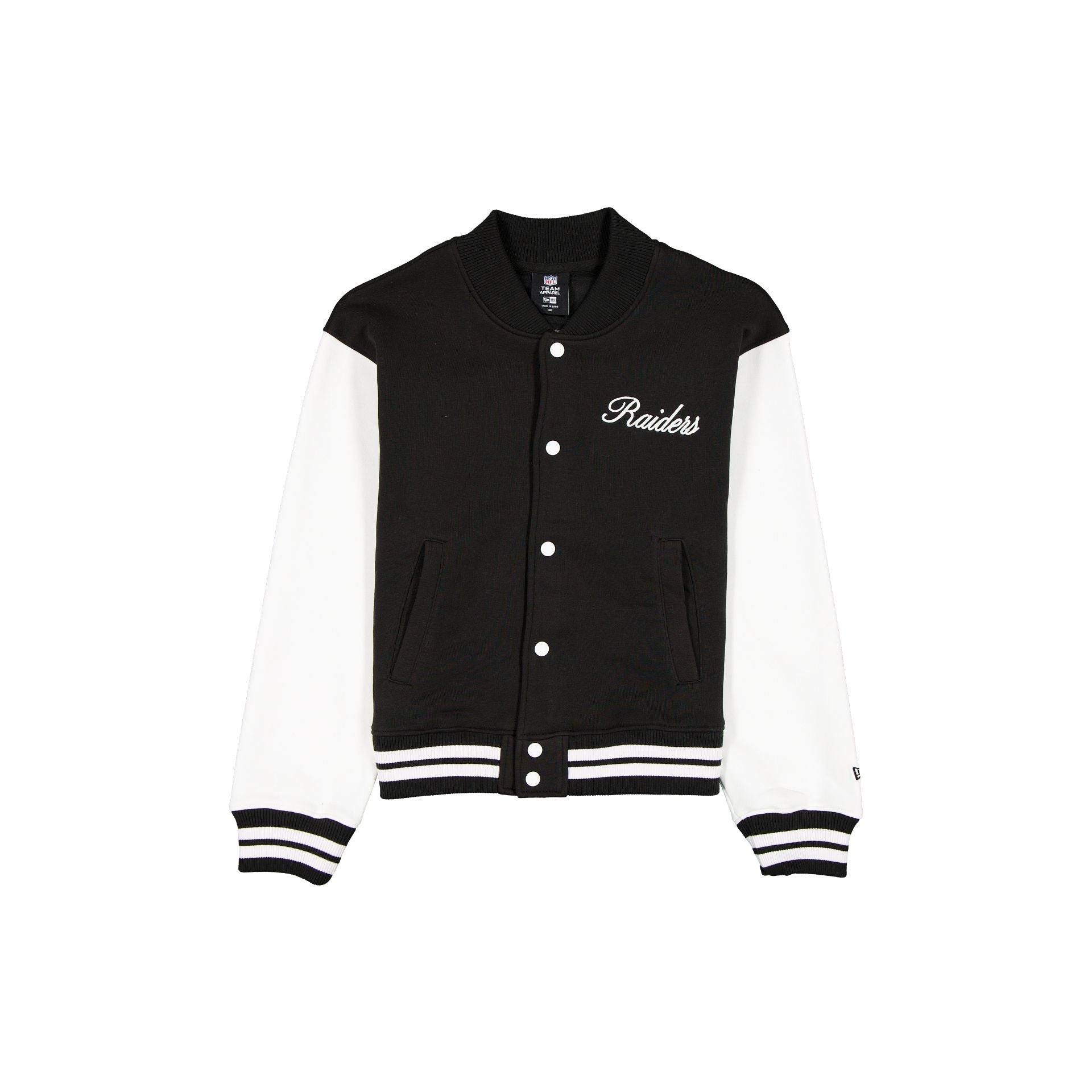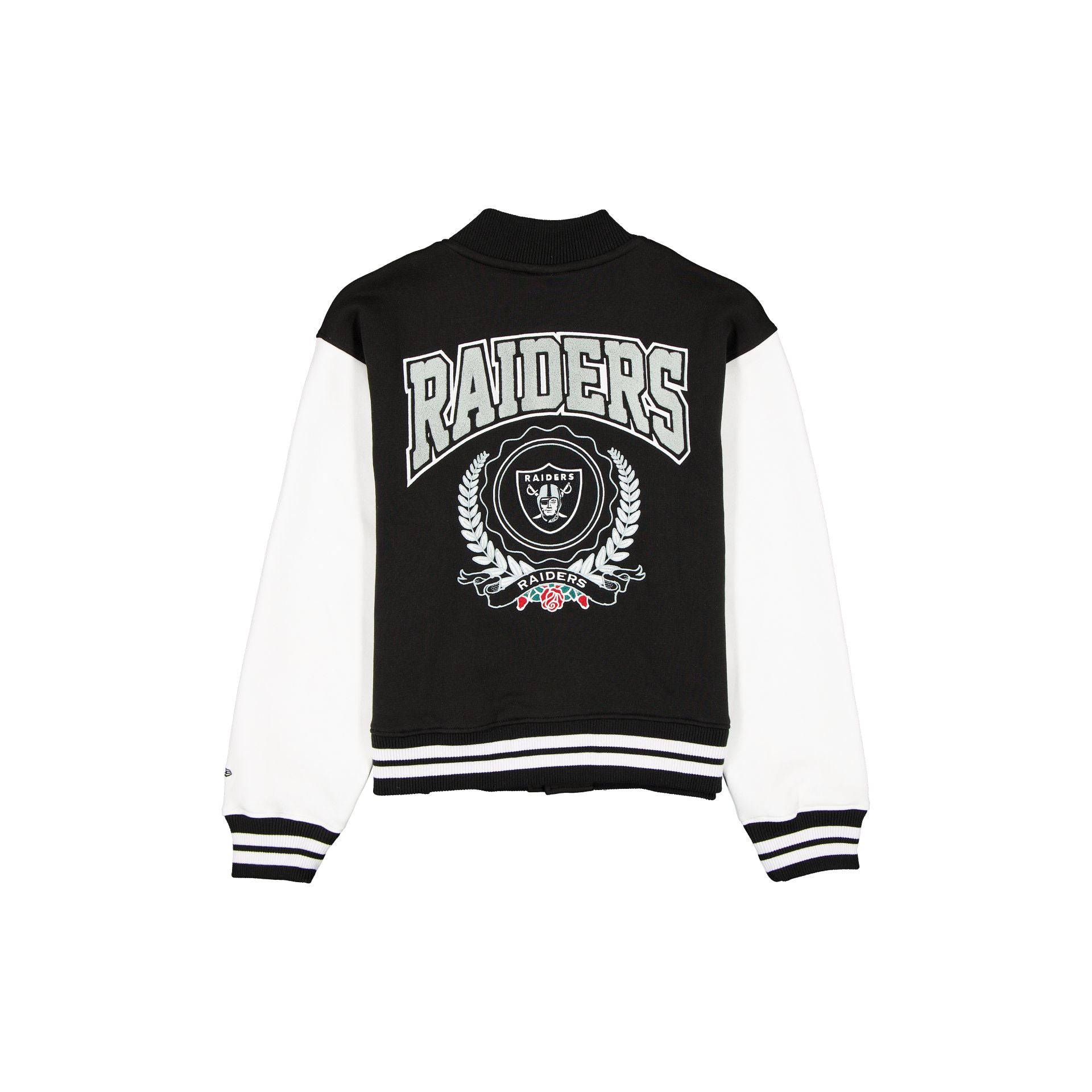The Las Vegas Raiders Throwback Prep Women’s Jacket features a chain-stitched Raiders script at the left chest with a snap front closure and a chenille applique wordmark with team emblem at the rear.
