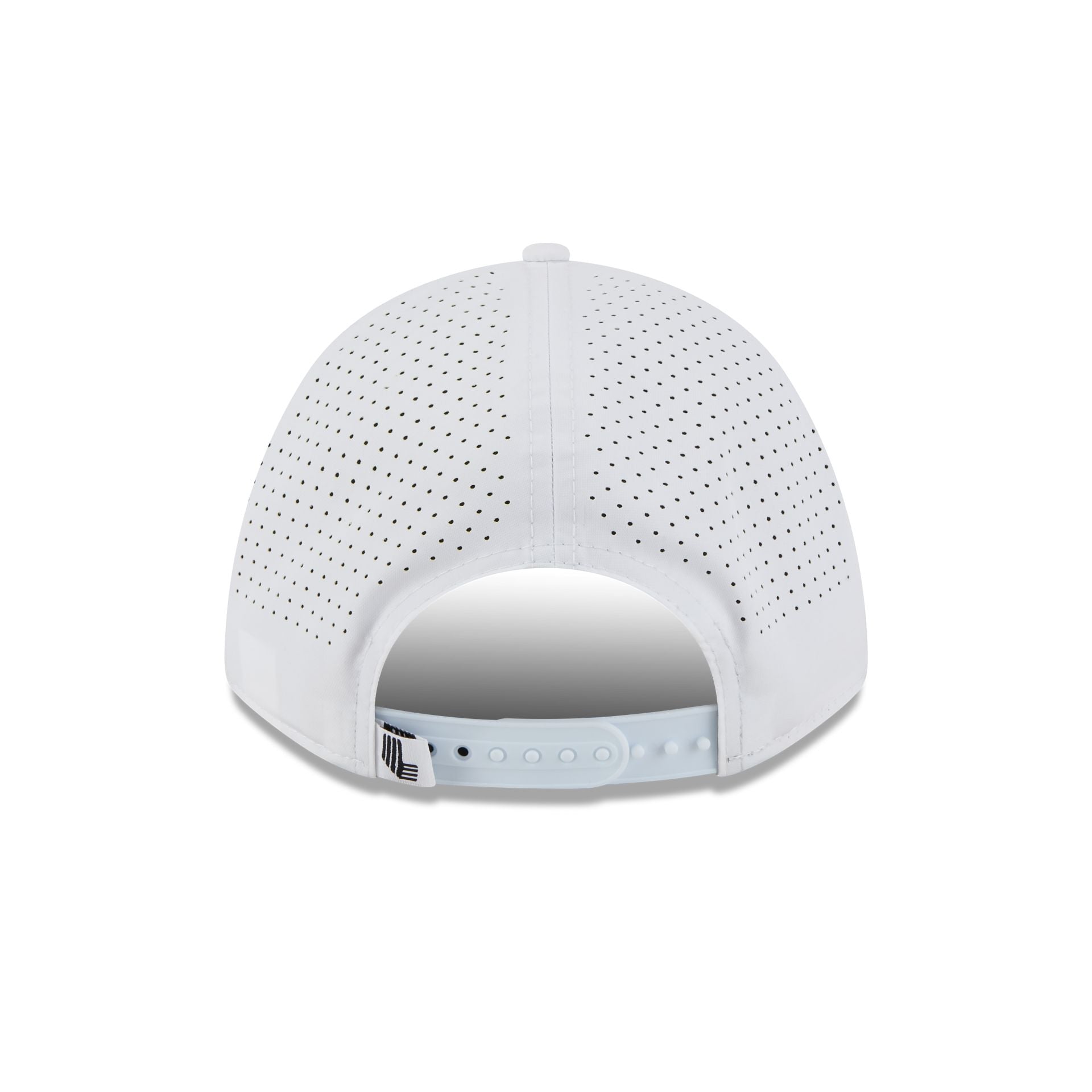 The LIV Golf Patch 9FORTY M-Crown A-Frame Snapback features an embroidered LIV Golf patch at the front panels with performance fabric throughout. Additional details include a LIV Golf tag on a snapback closure at the rear and a black undervisor.