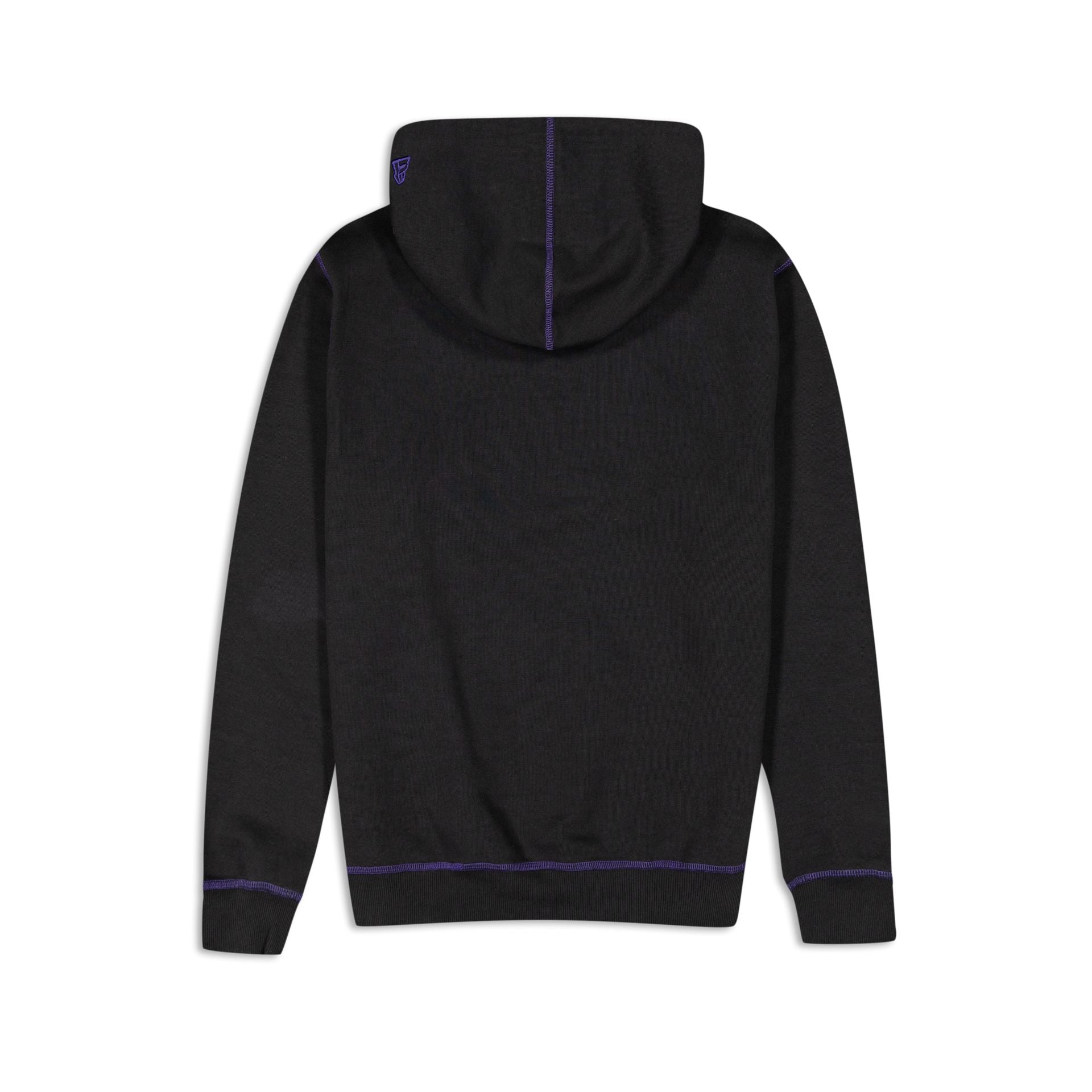 The Los Angeles Lakers 2023 City Edition Black Hoodie features a mesh applique Lakers wordmark and embroidered team logo at the chest with a team jock tag at the kangaroo pocket.