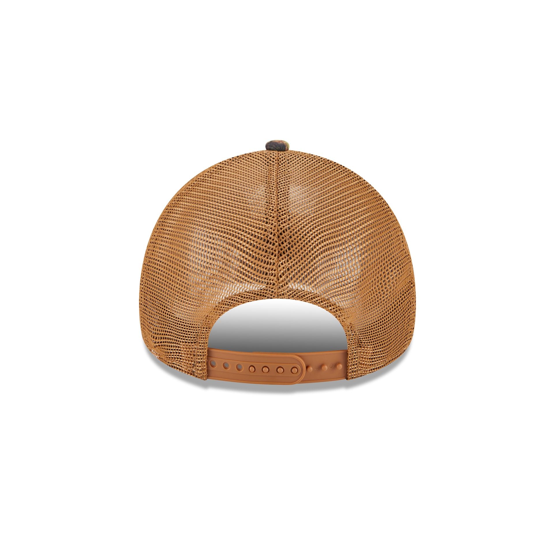 The Los Angeles Lakers 2025 All-Star Game Fan Pack Grove 9FORTY A-Frame Trucker features an embroidered Lakers wordmark at the front camo panels with a mesh back. Additional details include a team logo on the right-wear side. a snapback closure at the rear. and a gray undervisor.
