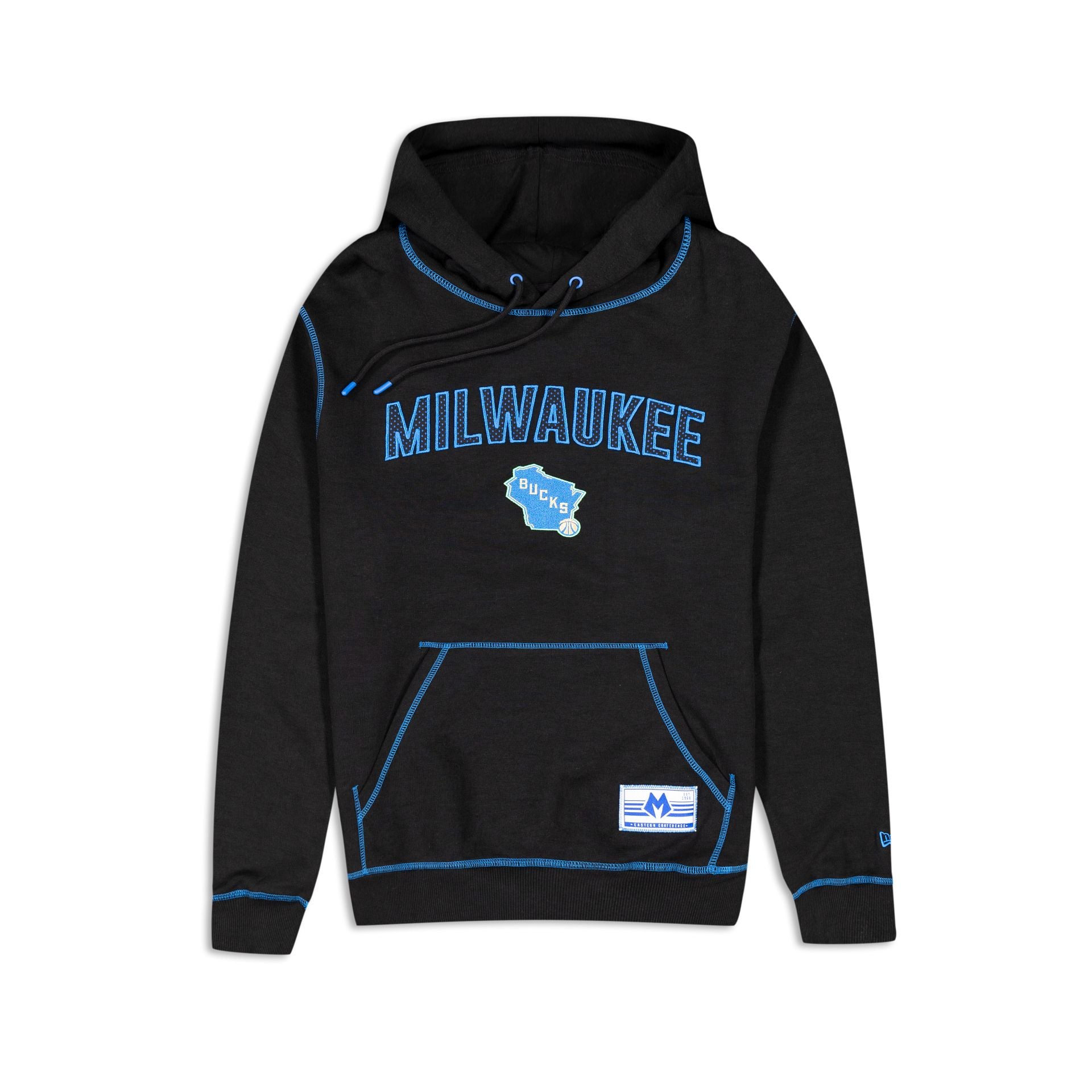 The Milwaukee Bucks 2023 City Edition Black Hoodie features a mesh applique Bucks wordmark and embroidered team logo at the chest with a team jock tag at the kangaroo pocket.