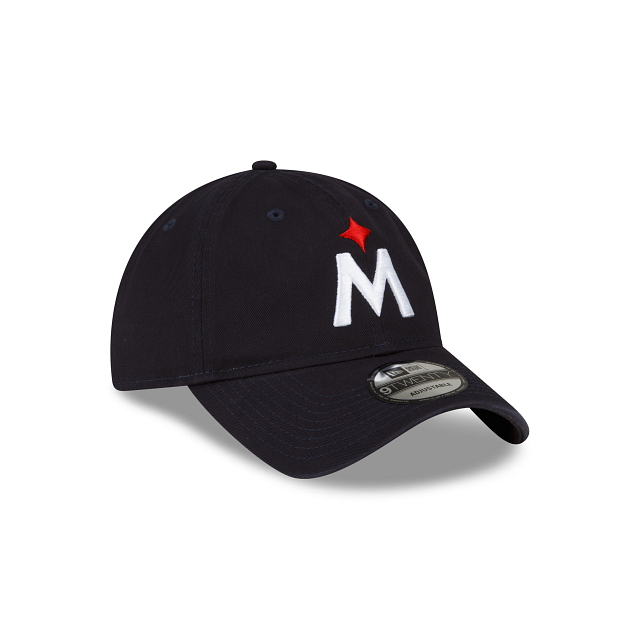 The Minnesota Twins Core Classic Road 9TWENTY Adjustable Cap features an embroidered Twins logo at the front panels with a woven tab displaying the team logo on an adjustable D-Ring closure at the rear.