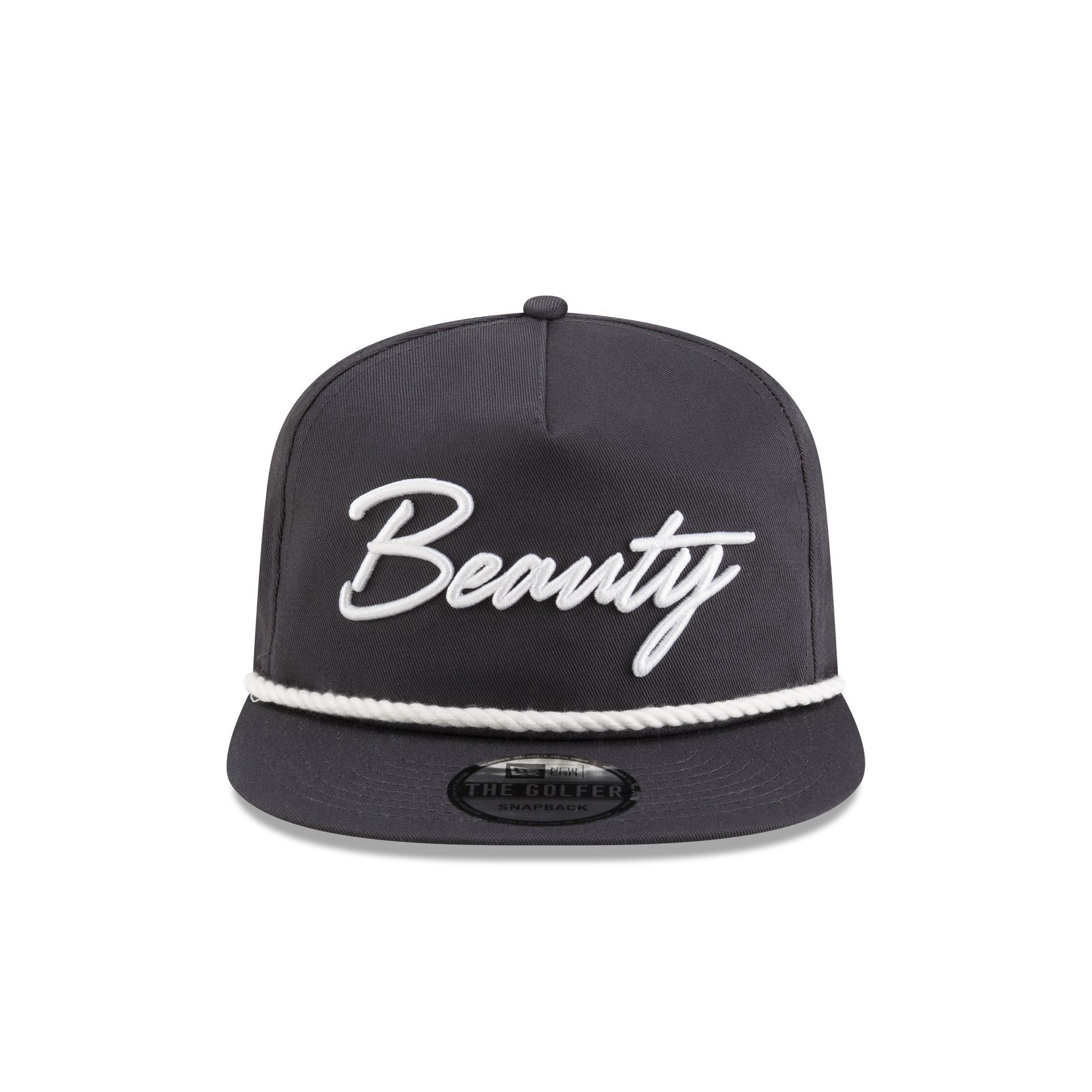 The New Era Cap Beauty Golfer Hat features an embroidered Beauty script at the front panels with a Buffalo patch at the right-wear side and a blue undervisor.