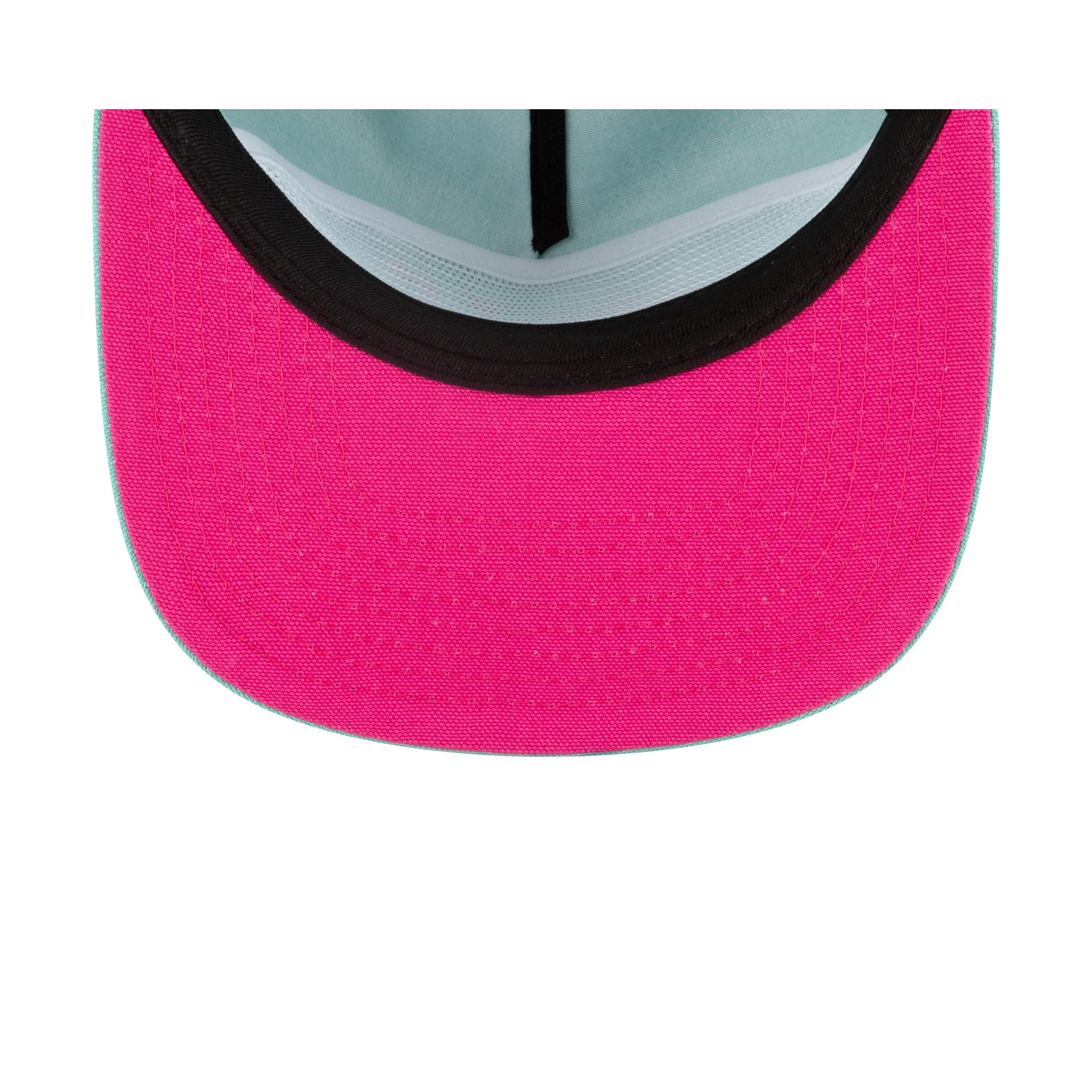 The New Era Golf Mint Green Golfer features an embroidered golf text at the front panels with a New Era Golf logo above a snapback closure at the rear and a pink undervisor.