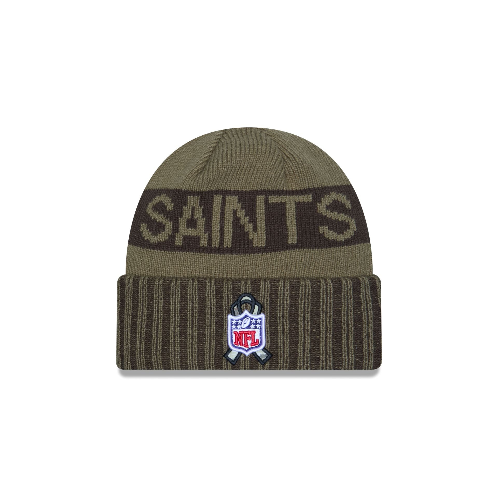 The New Orleans Saints 2025 Salute to Service Cuff Knit features an embroidered Saints logo at the front with a team wordmark at the crown. an American flag patch at the right-wear side. and the official NFL Salute to Service patch at the rear.